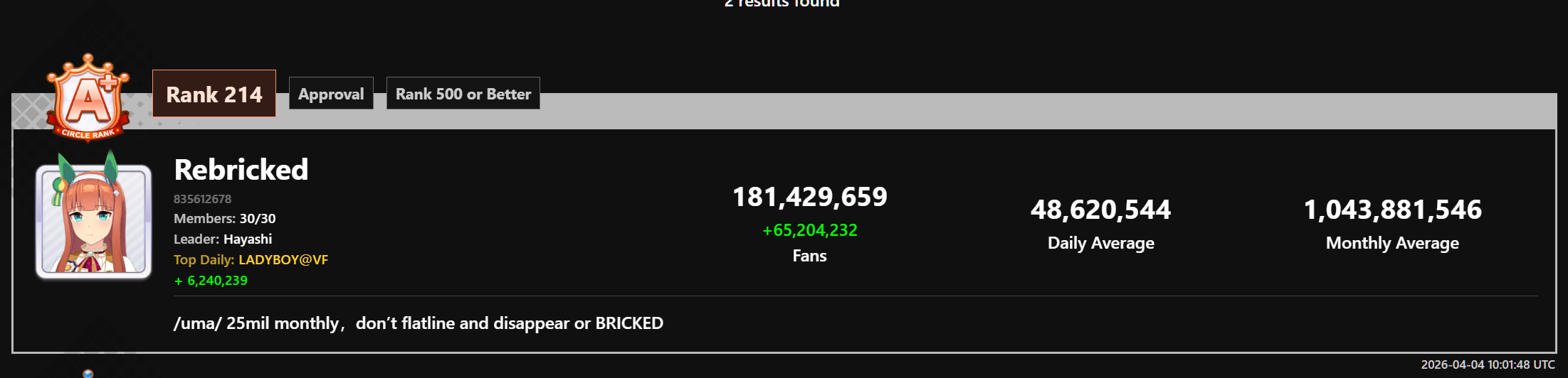 Previous: >>562490270>Global Game NewsLink your account to Cygames iDCurrent Scenario: Make A New Track aka "Trackblazer"Current Rate Up Trainee: Mejiro Bright (3*)Current Rate Up Support Cards: SSR Zenno Rob Roy (Guts), SSR Curren Chan (Speed)Current CM: Pisces Cup - Hanshin Turf 3200m>Schedule03/02 - 04/14 - Halved TP Cost & 2x Career Mode Rewards04/05 - Ballroom Seiun Sky (3*), Ballroom Fuji Kiseki (3*), Symboli Rudolf (SSR), Sirius Symboli (SSR)04/05 - Ligne Droite Story Event04/12 - Nishino Flower (3*), Daiwa Scarlet (SSR), Sweepy (SR)04/20 - Yaeno Muteki (3*), Ines Fujin (SSR), Twin Turbo (SSR)04/20 - Aries Cup - Medium/Right/Spring/Firm/200004/26 - Golshi Week Celebration04/26 - Cheerleader Nice Nature (3*), Cheerleader King Halo (3*), Bamboo Memory (SSR), Seeking the Pearl (SSR)04/26 - Tracen Cheer Squad Story Event04/30 - Ines Fujin (3*), MR. C.B. (SSR), Tokai Teio (SR)https://pages.snep.pw/uma/anni-skill-changes>JP Game NewsCurrent Rate Up: Sakura Bakushin O (3* alt), North Flight (3* alt), SSR Daring Tact, SSR Daring HeartNew Scenario "Beyond Dreams" releasedTimeline: https://uma.moe/timelineCygames Webstore: https://webstore.cygames.com/en/umamusume_en>Thread Clubshttps://rentry.co/umaglobalclublistYou must be E3 (20k points) to join a circle. Apply with /uma/ or /vg/ in your profile or post ID in the thread.>All Guides & Resourceshttps://rentry.org/uma26Game databasehttps://gametora.com/umamusume (Click the gear to switch between JP / global server info)A basic guide for newfagshttps://rentry.org/umaglobalFind networks if your region is blocked from the game or clienthttps://www.umavpn.topSeiyuu & Concertshttps://rentry.org/umstUmamusume Birthday Calendarhttps://ウマ娘.攻略.tools/events/birthdayUma Texthttps://umareader.idsmile.xyzCustom Stickershttps://schizo.farm/resources/stickers