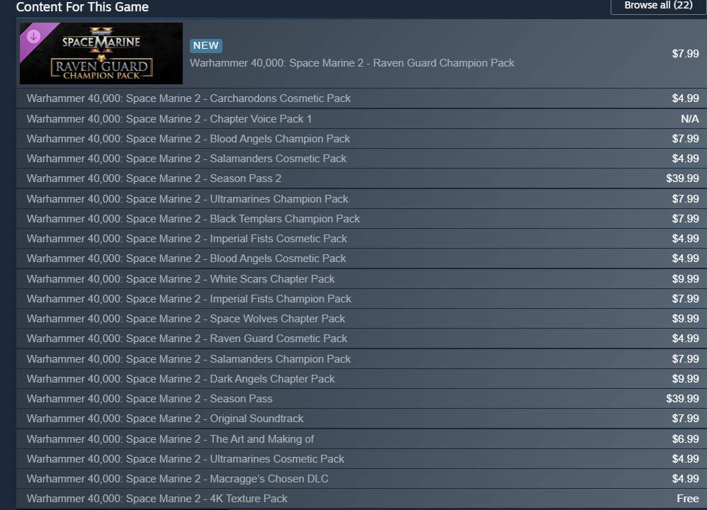 >have an oc donut steel raven guard subchapter paint scheme for all classes>they were going to do the raven guard voice next>completely bungled the first voice pack by underestimating how much extra work it'd be and underdelivering on what the fans would actually want>now they're just not going to do voice packs ever again
