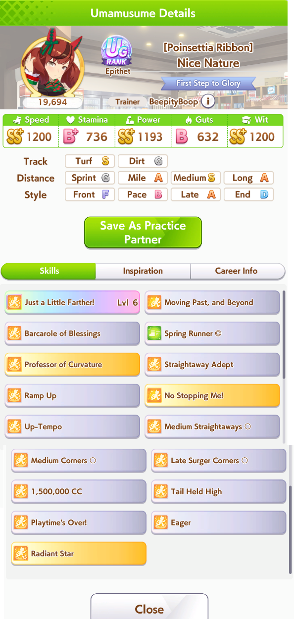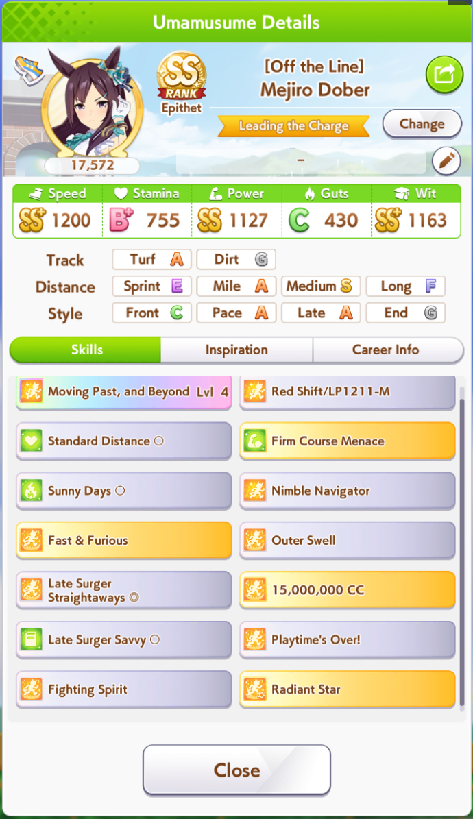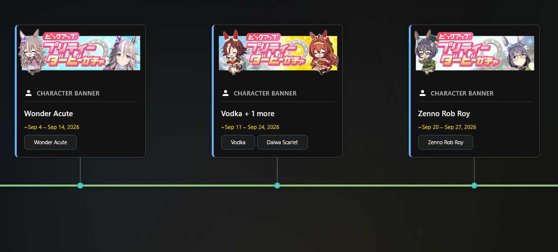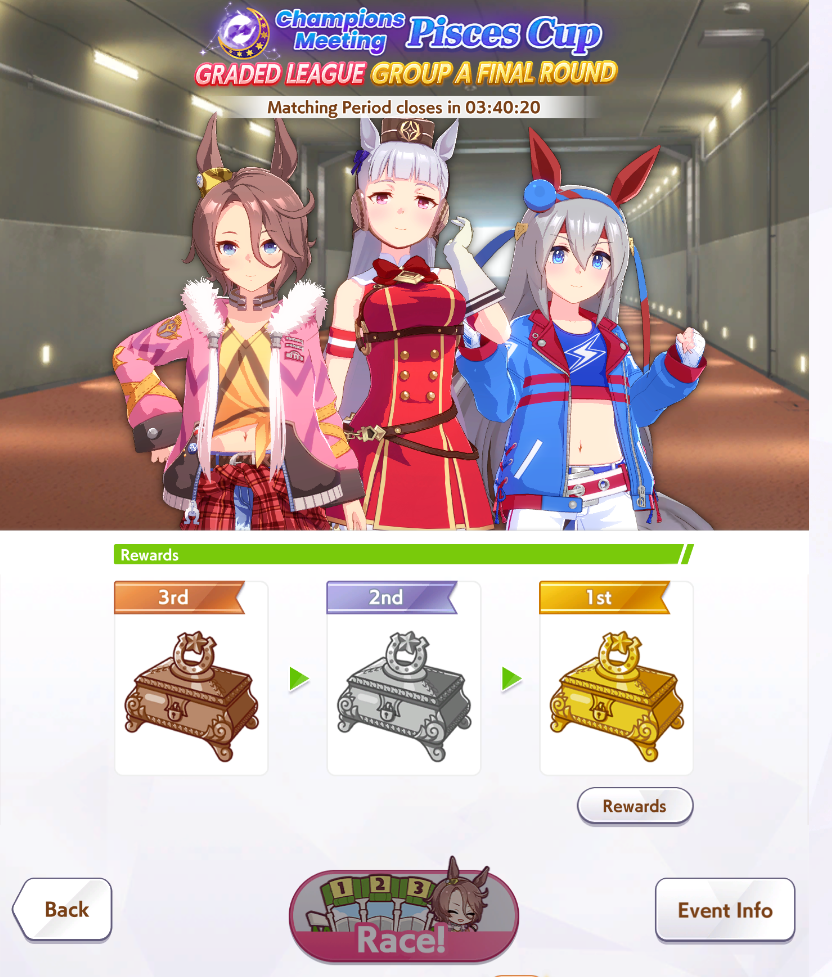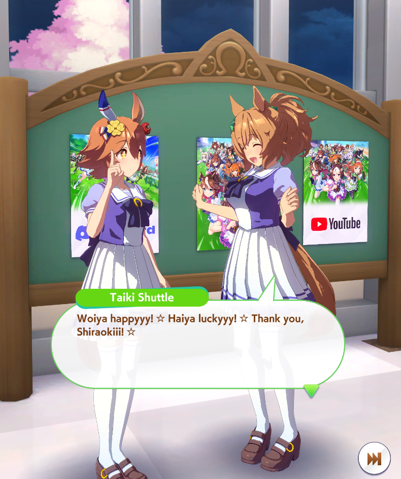 Previous: >>562506435>Global Game NewsLink your account to Cygames iDCurrent Scenario: Make A New Track aka "Trackblazer"Current Rate Up Trainee: Mejiro Bright (3*)Current Rate Up Support Cards: SSR Zenno Rob Roy (Guts), SSR Curren Chan (Speed)Current CM: Pisces Cup - Hanshin Turf 3200m>Schedule03/02 - 04/14 - Halved TP Cost & 2x Career Mode Rewards04/05 - Ballroom Seiun Sky (3*), Ballroom Fuji Kiseki (3*), Symboli Rudolf (SSR), Sirius Symboli (SSR)04/05 - Ligne Droite Story Event04/12 - Nishino Flower (3*), Daiwa Scarlet (SSR), Sweepy (SR)04/20 - Yaeno Muteki (3*), Ines Fujin (SSR), Twin Turbo (SSR)04/20 - Aries Cup - Medium/Right/Spring/Firm/200004/26 - Golshi Week Celebration04/26 - Cheerleader Nice Nature (3*), Cheerleader King Halo (3*), Bamboo Memory (SSR), Seeking the Pearl (SSR)04/26 - Tracen Cheer Squad Story Event04/30 - Ines Fujin (3*), MR. C.B. (SSR), Tokai Teio (SR)https://pages.snep.pw/uma/anni-skill-changes>JP Game NewsCurrent Rate Up: Sakura Bakushin O (3* alt), North Flight (3* alt), SSR Daring Tact, SSR Daring HeartNew Scenario "Beyond Dreams" releasedTimeline: https://uma.moe/timelineCygames Webstore: https://webstore.cygames.com/en/umamusume_en>Thread Clubshttps://rentry.co/umaglobalclublistYou must be E3 (20k points) to join a circle. Apply with /uma/ or /vg/ in your profile or post ID in the thread.>All Guides & Resourceshttps://rentry.org/uma26Game databasehttps://gametora.com/umamusume (Click the gear to switch between JP / global server info)A basic guide for newfagshttps://rentry.org/umaglobalFind networks if your region is blocked from the game or clienthttps://www.umavpn.topSeiyuu & Concertshttps://rentry.org/umstUmamusume Birthday Calendarhttps://ウマ娘.攻略.tools/events/birthdayUma Texthttps://umareader.idsmile.xyzCustom Stickershttps://schizo.farm/resources/stickers