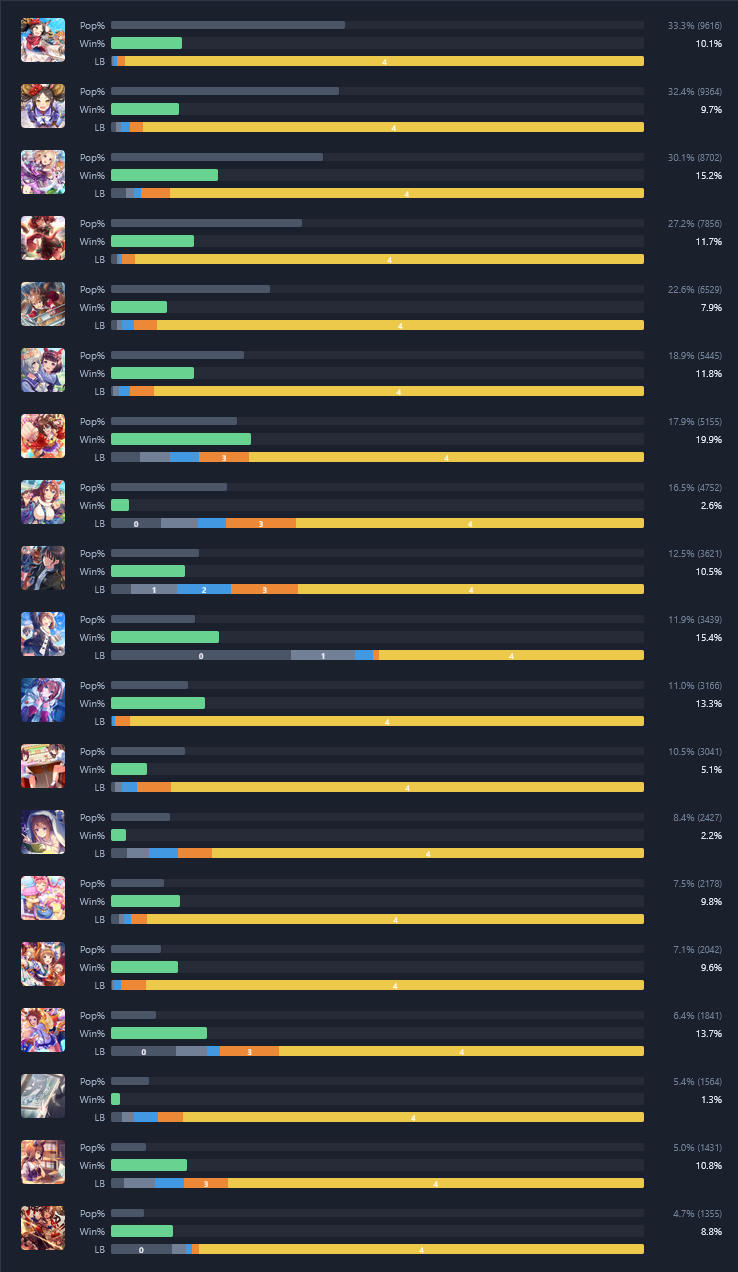 >>562539581All of them.Despite sloptuber gaslights, anyone who cares about CM either rolled for her or got her with the voucher. Anyone not running their own AMOguri is trolling.And yes, I'm sure there will be anons who will win plat with their triple fronts or their triple dominators, but those will be outliers.