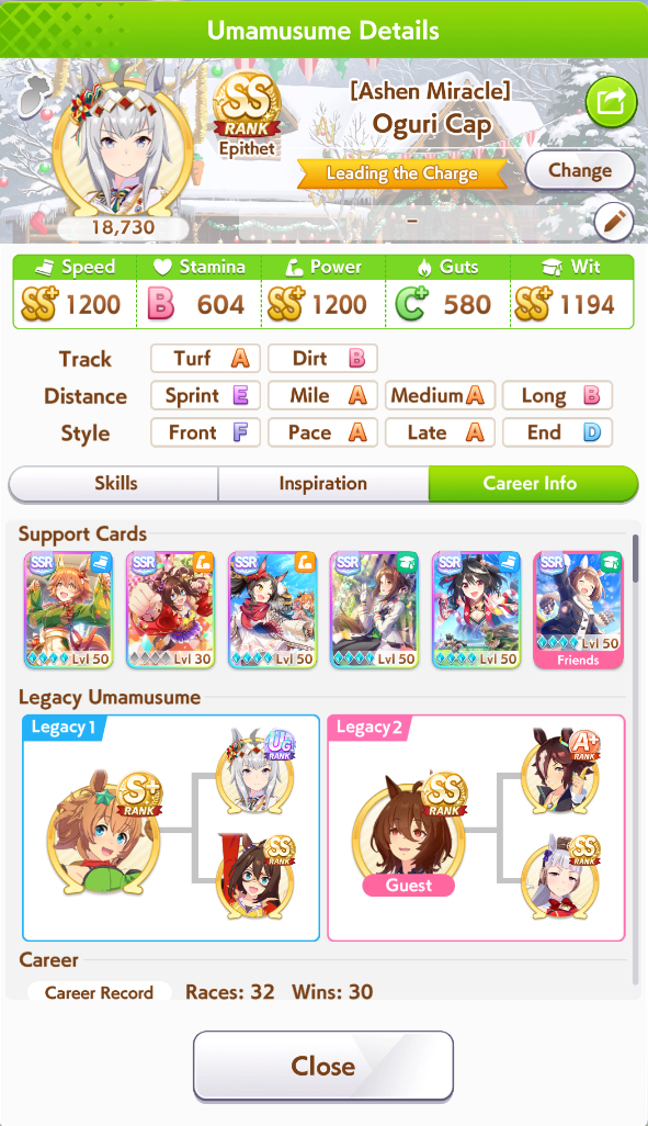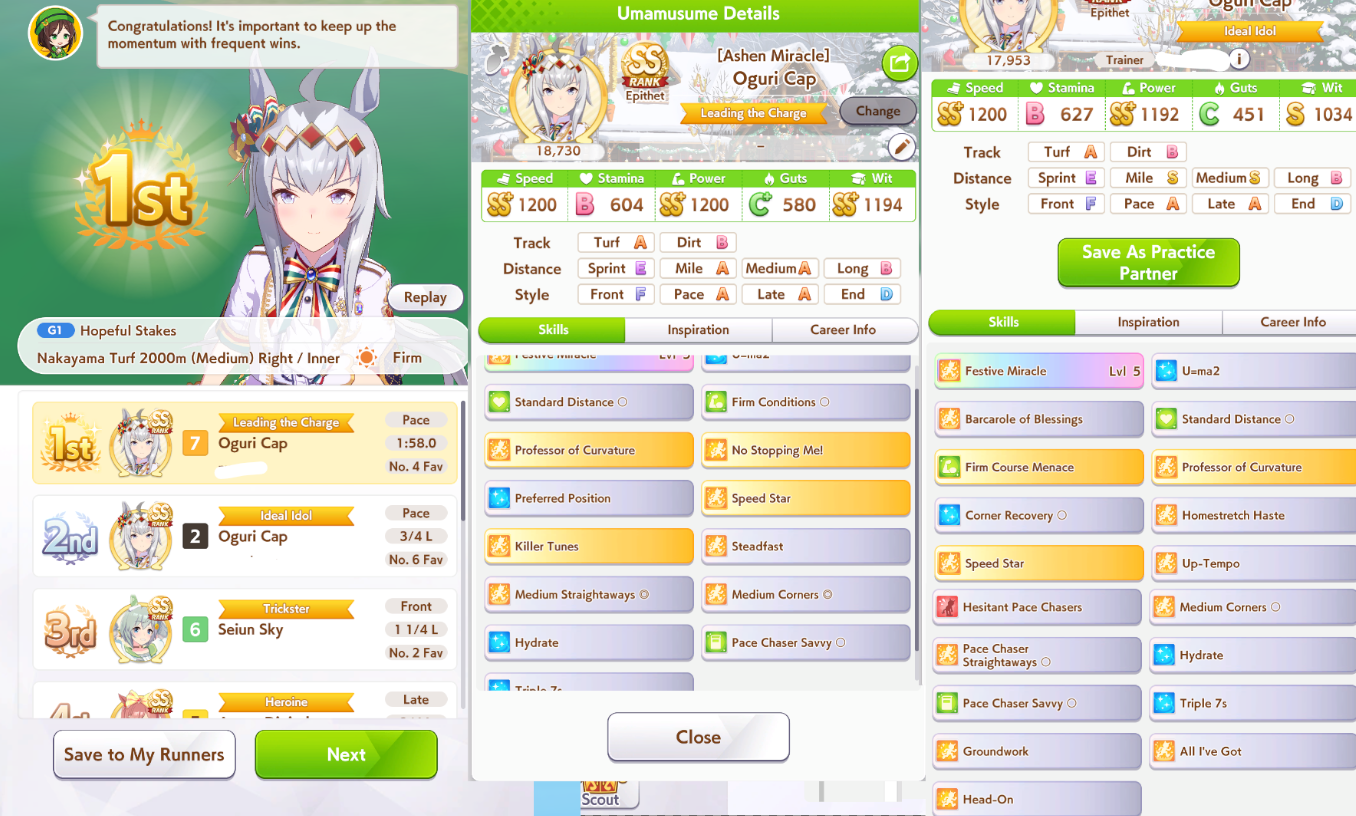 >>5625361672 plats but they were phenomenal wins, Laisu only won 4 times in all of Virgo and they were during Round 1, decided to win the one race that matters in Finals. Capricorn was a Christmas Biwa win, was scary because one team had 65 wins, but Shiraoki-sama deemed me worthy because that guy's Hoguri whiffed a heal to never proc ult. Scorpio is the only loss I feel sad about because I had a fun gamba KKK Pasa who decided to rush into 4th on final corner without using her actual accels, then lost to an Ass Wonda by a nose. But every other loss was expected, lobbies with stronger teams and/or better timed ability procs.