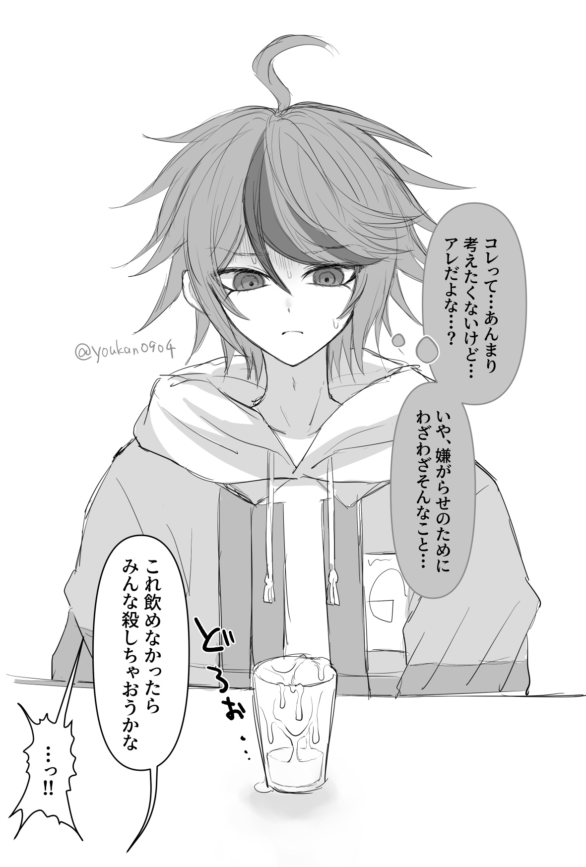 >(This is… I don't really want to think about it… but it's *that*, isn't it…?)>(No, he wouldn't go out of his way to do that just to be mean…)>"If you can't drink this, maybe I'll just kill everyone.">"...!!"