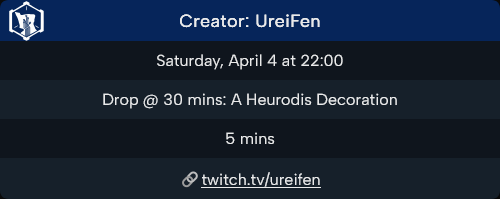 >https://twitch.tv/ureifenUreiFen live in 5mDrop:1. 30m - A Heurodis Decoration