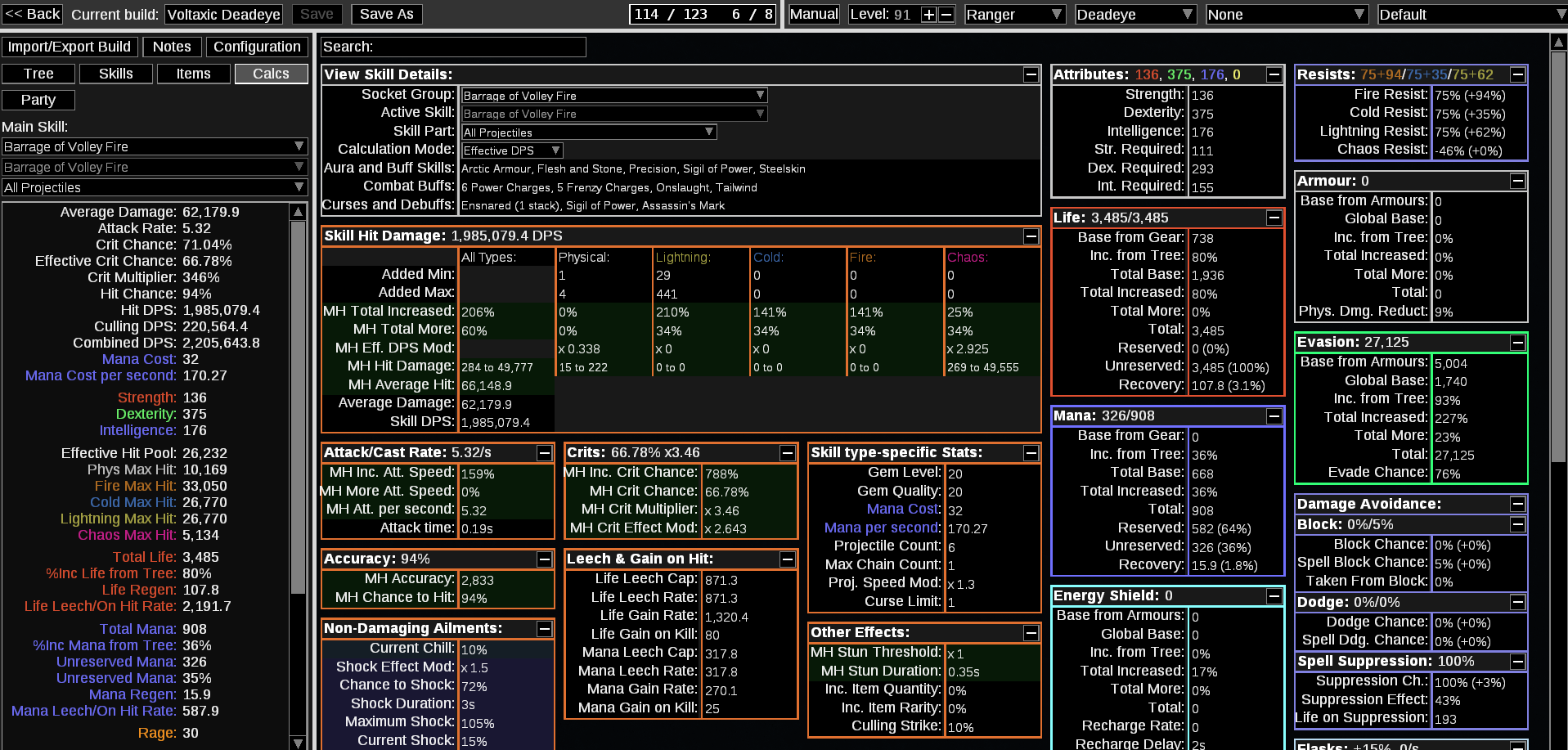 >>562551724>>562553148Seems kinda low. Barrage is a bossing skill so it should be able to hit 100M.PoB doesn't calc everything, so it's not true dps, but that's lowGet your 4th Ascension for +2 Arrow for like 30% more dpsGet a higher crit roll on your amulet and annoint it for Selective Precision. Then use Greater Devour for soul eater now that you can drop the Return GemMassive Thread of Hope next to Supreme Ego can get you some good notables for cheapish3 points for Cornered Prey is good since you attack so fast the bleed requirement is easily met.Quiver needs +1 arrow or it's shitForbidden Flesh and Flame for Nature's ReprisalCrit Chance quality your Bow with Horticrafting Station. Look for a good double corrupt Voltaxic w/ Crit Chance quality.Unique flasks are good but pricey.From there it's shrinking your tree into a double cluster setup. You look for 8 passive cluster jewels with 3 notables. Make sure the 3rd one is in the back because you won't take that one. Stack good jewels.The endgame for Voltaxic archer is Str Stacking with Replica Alberon's Warpath. Any attribute stacker gets expensive fast. At least 200d for something viable, but can keep scaling well beyond that.