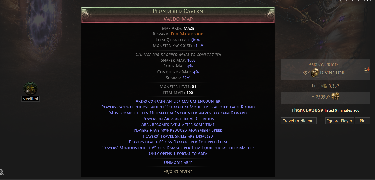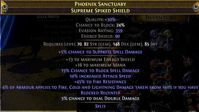 Foulborn Rathpith GlobeTitanium Spirit ShieldQuality: +20%Chance to Block: 25%Energy Shield: 218Item Level: 83Requires Level 68, 159 Int11% Chance to Block Spell Damage160% increased Energy Shield10% increased maximum LifeSacrifice 10% of your Life when you Use or Trigger a Spell SkillDeal 5% increased Damage Over Time per 100 Player Maximum Life2% increased Effect of Non-Damaging Ailments you inflict with Critical Strikes per 100 Player Maximum Life205 divinesYOU MOTHERFUCKERS