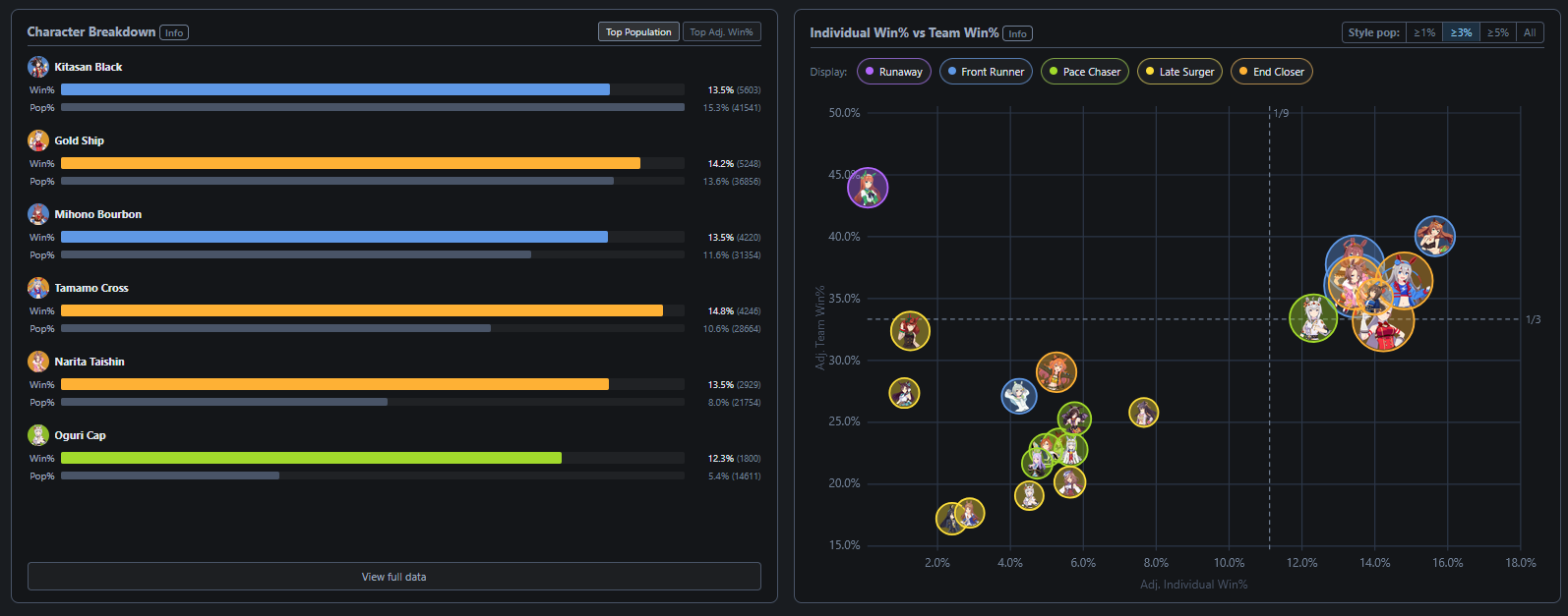 a few of these are accomplished dirt horses, but the NAR's dirt G1s aren't internationally recognized. most of these had a long record of placing well in a lot of G1s, but never winning one, which still makes them strong horses. the rest are horses who had high expectations that they were unable to deliver on due to health problems. i have absolutely no idea why samson big is a part of umamusume.
