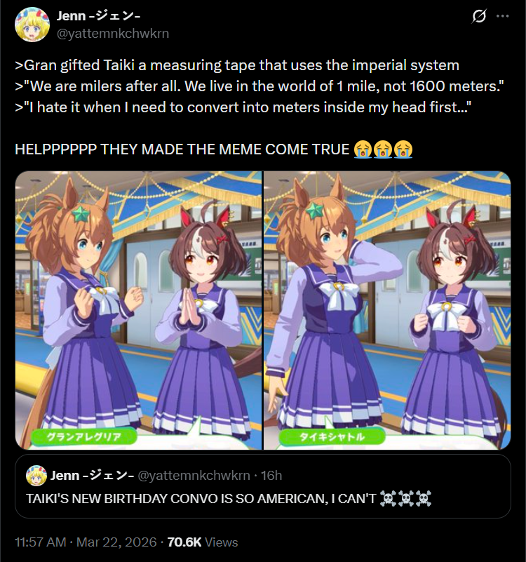 yeah this was literally a plot point in CinGray. Oguri Cap asks Rudolf to step up and use her influence to get it to change, and Rudolf is only considering it until Maruzensky wistfully notes that she would've loved to have run in the classics herself...