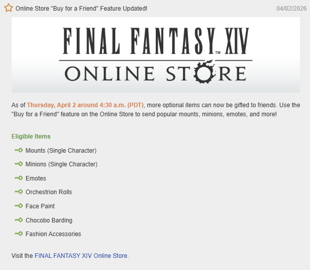 >Moogle Treasure Trove - (March 31st -> April 28)https://na.finalfantasyxiv.com/lodestone/special/mogmog-collection/202603/lba1j4i815>Patch 7.45 Noteshttps://na.finalfantasyxiv.com/lodestone/topics/detail/2e8a10c44121af50ce86e1b605e10608e15f24d6>Hatching Tide (March 23rd - April 6th)https://na.finalfantasyxiv.com/lodestone/special/2026/Hatching_tide/wgtbl3kgc5>Resourceshttps://rentry.org/xivgresources>Meetups• April 4, 8:00 PM EDT | Dynamis, Golem | New Alt FC >>561137994• April 10, 9:00 PM EDT | Crystal, Mateus Mist W24 P3 | xivg orgy meet 2 >>562480120 • April 10, 10:00 PM EDT | Crystal, Mateus | Casual Queue Murder Meet >>562478015 • April 17, 4:00 AM PDT | Sophia, Materia | Eulmore, The Beehive | Live Letter Meetup >>562390635 • April 19th, 16h (4pm) CEST | Light, Lich, Empyreum, W7 P48 | Frenchra movie: Pulp Fiction >> 561912764• April 25, 10:00 PM EDT | Dynamis, Cuchulainn | Empyreum W27 P52 | RP Speedmeeting >> 562561983Previous: >>562563912