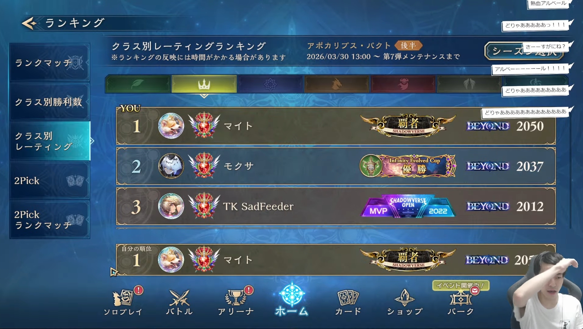 >NewsEvolving Guild Chest Event! (April 4th 2 am - April 12th 8 pm UTC)https://shadowverse-wb.com/en/news/detail/?id=01KMEYCPZD2CMK20C6VFD4JY55SVO 2026 Season 1 - Preliminary 1! (Registration Period, April 3rd 5 pm - April 13th UTC)https://shadowverse-wb.com/en/news/detail/?id=01KMMX01965JDK3RH90D418KXDEnd of Service for Shadowverse 1 (July 1st, 2 am UTC)https://shadowverse.com/news/?announce_id=3337>6th Card Set: Apocalypse Pacthttps://shadowverse-wb.com/en/cards/pack/apocalypse-pact/https://www.youtube.com/watch?v=5twIjKWQBeI>Resource Guide (decks, tier lists, guilds, stickers, and leader trailers)https://rentry.org/svg-resourcesOfficial website & deck portalhttps://shadowverse-wb.com/en/https://shadowverse-wb.com/en/deck/Shadowverse Evolve TCGhttps://en.shadowverse-evolve.com//svg/'s card & leader database and deckbuilder (classic)https://svgdb.meShadowverse: World's Beyond Card Databasehttps://mhmkhlrdn.github.io/WBGDB/SiteLast Showdown: >>562385526