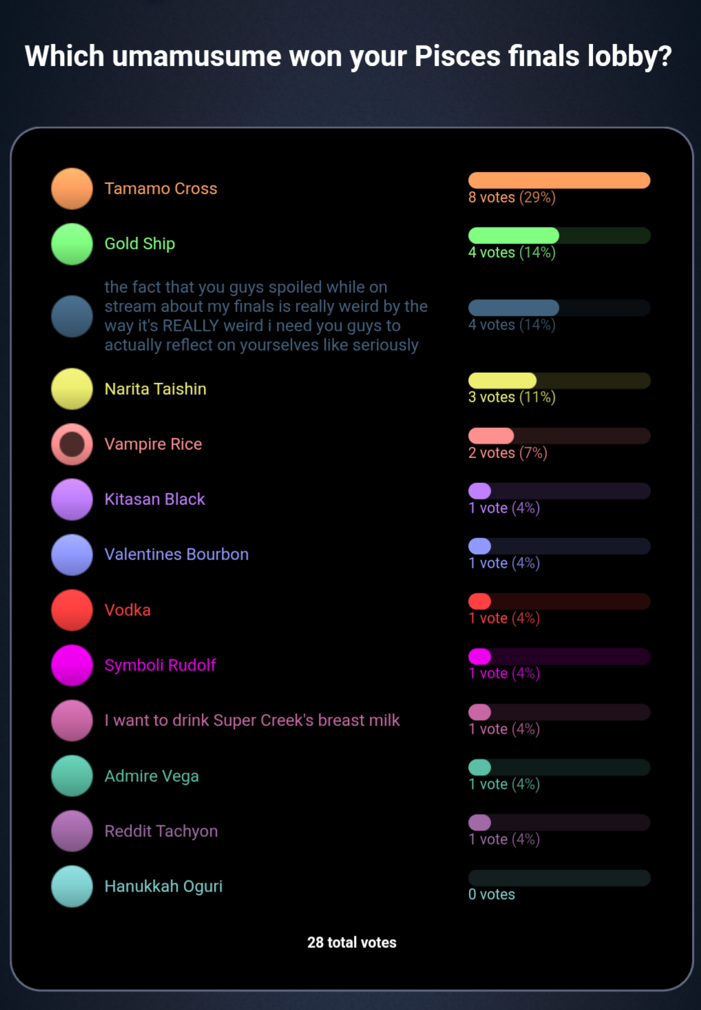 >>562580248>Took that stupid Buzzfeed what uma are you quiz because everyone else was doing it>Site glitched, crashed, and didn't give me my result>Thought about the question for a while, realized Vega is the most like me and it's not closeHow many of us are there in this general?