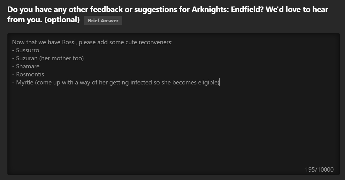 I would rather they just keep the existing gacha system while just shaving off the obtuse extraneous bits and just making it more straightforward. At a base level I do genuinely prefer Endfield's more "archaic" gacha system over the post-Genshin type. It just needs the weird warts cleared off like>+10 rolls at 30 (but doesn't count towards pity)>+10 rolls at 60 (but only for next banner and ONLY next banner)>getting punished for being lucky (getting rate up early means lack of arsenal tix)Hard pity not carrying over is a non-issue to me, but I do wish winning your 50/50 didn't consume it. I'd honestly be more willing to roll for pots if it wasn't. And if I had my way I'd also ask for a slight bump to the regular income of oroberyls/arsenal, but if it came down to it, I'd be happy with just a bump to arsenal income. I don't have an issue with having to skip every 1-2 banners in order to save up oroberyls for my hard pity safety net. The gambling system isn't meant to be my friend