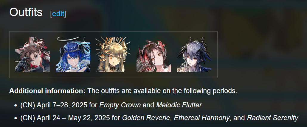 Previous thread: >>562535925Happy birthday to Rope and Utage!>CURRENT, FUTURE GLOBAL/JP/KR CONTENT:[3/27-4/10][Standard]6* Sniper Pozemka, 6* Defender Jessica the Liberated (Shop), 5* Sniper Melanite, 5* Medic Record Keeper, 5* Supporter Quercus (Shop)[4/1-4/22]Icebreaker Games #2 - Chiave skin[4/1-4/15][Joint Operation]6* Sniper Narantuya, 6* Guard Degenbrecher, 6* Sniper Lemuen, 6* Caster Ho'olheyak, 5* Vanguard Mitm, 5* Specialist Wulfenite, 5* Supporter Grain Buds, 5* Sniper Lunacub, 5* Caster Santalla, 5* Sniper Greyy the Lightningbearer>CURRENT, FUTURE CN CONTENT:[3/26-4/9][Standard]6* Supporter Stainless, 6* Sniper Ray (Shop), 5* Sniper Kichisei, 5* Defender Bassline, 5* Caster Santalla (Shop)[3/27-4/10]When Elegies Are Ashes - Brigid skin[3/27-4/10][Returned From A Pyre]6* Caster Necrass, 5* Specialist Wulfenite, 5* Defender Firewhistle[4/7-4/21]People, A People - 5* Supporter Botanik[4/7-4/21][Rage of the Many]6* Zima the Raging Tide, 5* Medic Ukusik, 5* Vanguard Mitm[4/7-4/21][Ambiance Synesthesia]Nymph, Surtr[TBA][Ambiance Synesthesia]Lemuen, Necrass, Saria>/akg/ website:akgcc.github.io>AK EN Database:puppiizsunniiz.github.io/AN-EN-Tags/akhrchars.html>More valuable resources:rentry.org/akg_resources>/akg/ merch guiderentry.co/akg_merch