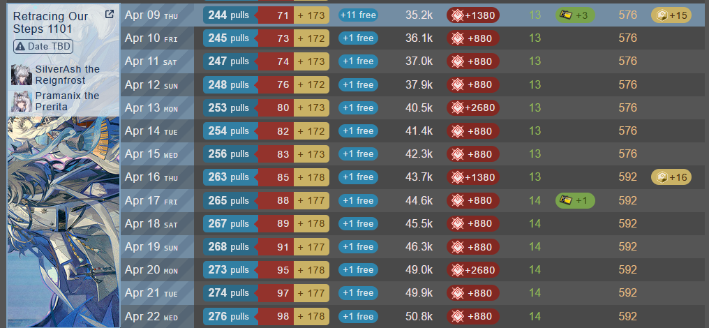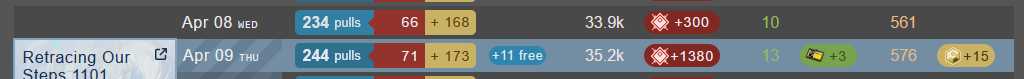 >>562607142It doesn't. Look at pic related. Goes from 234 to 244 pulls despite +11 free pulls. The 10 pulls comes from the 3 permits, 1380 orundum, and 15 OP.