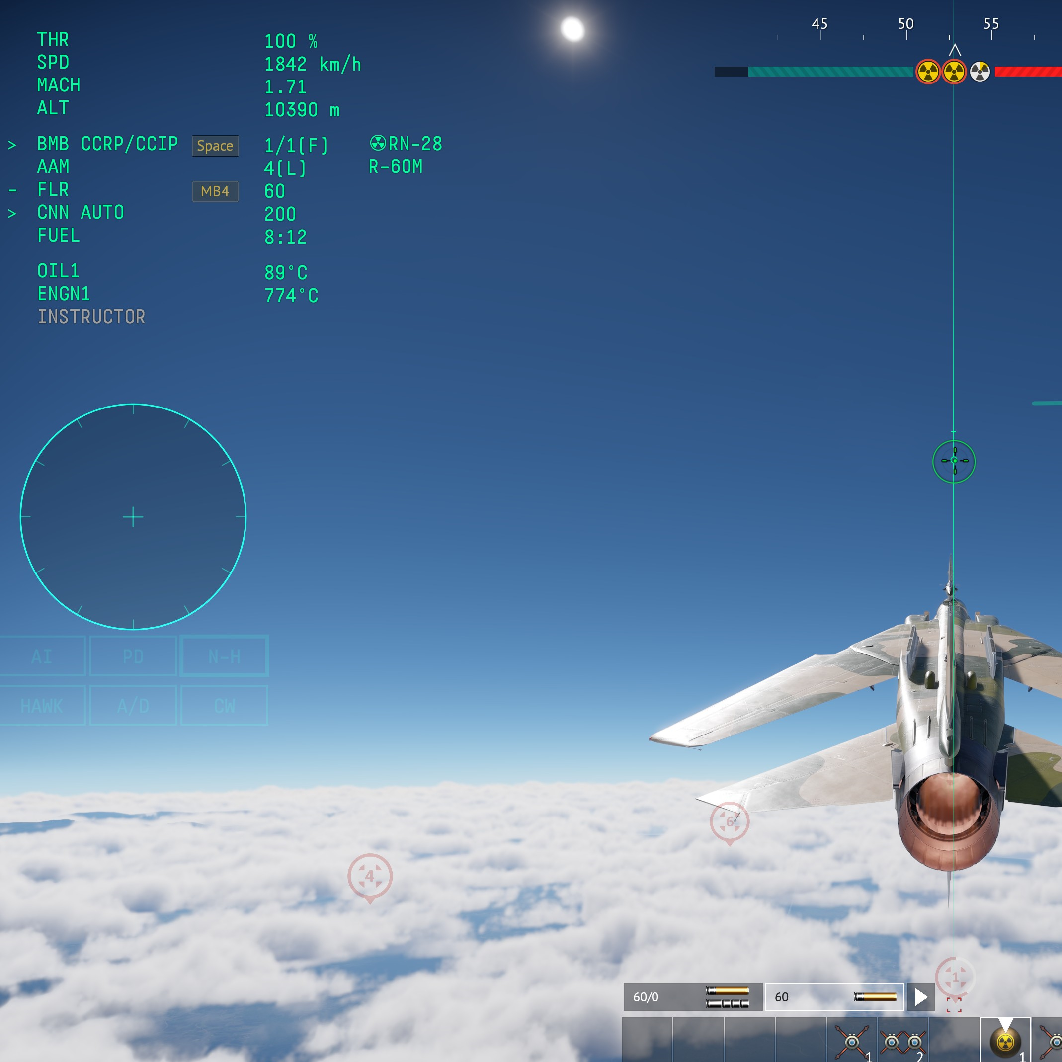 >>562593690The best way to earn score is to just be really good at air combat, but telling that to someone new isn't very helpful. I'm assuming that you're using the F-4E. Some tips if you're using the F-4E.>Keep your radar in air combat mode. There's not much point for you to distract yourself looking at the search scope.>just bring flares as your countermeasures. There aren't that many radar guided missiles flying around, and you'll mostly be defeating them with multipathing rather than notching/chaffing.>In your settings, enable radar altimeter and set it to turn red at 50m. Try to stay between 30-50m altitude to thwart enemy radar missiles.>in a head-to-head, against a mig-23, start pre-emptively flaring around the 2km mark. You don't need many. Just a flare every second or two to completely fuck over his ability to lock you with a r60/24t. If you stay low then he can't get you with a 24r. You can be significantly more liberal with your guns than he can.>If you see anyone start climbing to the point where the ground is no longer a factor, lock him with your radar and hit him with a dogfight sparrow. It doesn't matter if he chaffs. Just hold the lock until the missile hits or completely misses.>try to third-party people by flinging 9L's at opponents that are fighting someone else.Try to get a few air kills and then start throwing nukes at things. Watch some youtube videos to learn how to use the CCRP bomb computer to toss bombs. You can get some decent score by destroying tank convoys, airfields, or sneaking around and killing the S300 battery. Sneak around the sides of the map when going for airfields or the S300s. The osas are very deadly, but if you're careful you can stay out of their max range.