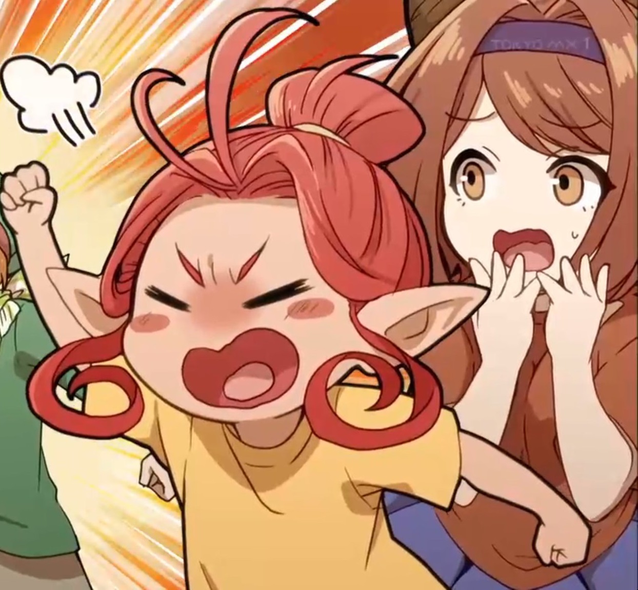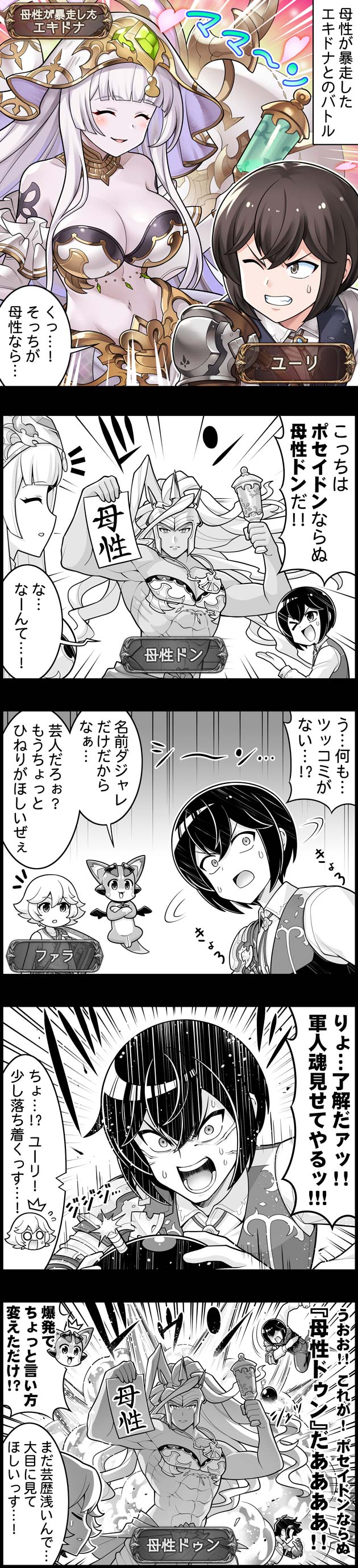 >>562683728The humor in this comic centers on a bad pun and Yuri's increasingly desperate attempts to make it land. The scene begins with a battle against Echidna, who is overwhelming the party with her "maternal instincts." Yuri decides to counter this by summoning Poseidon, but specifically a version he calls Maternity Don (Bosei-don). This is a play on words combining the Japanese word for maternity, Bosei, with the name Poseidon.When Yuri's pun met with a dead silence from his teammates, the small dragon character points out that it is just a lazy play on words and expects more from a performer. Feeling the pressure to be funny, Yuri takes a literal "bomb" approach. He decides to show off his "soldier's soul" by physically detonating an explosion to provide the missing punchline. The final panel shows him screaming in excitement as the explosion goes off, while the dragon dryly notes that he didn't actually improve the jokeāhe just added a loud noise to distract from how bad the pun was.