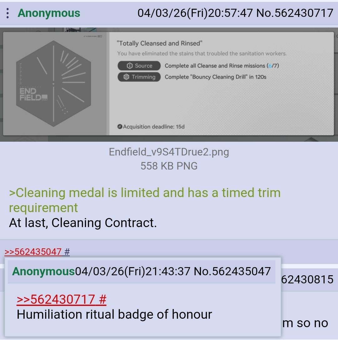 Previous: >>562584237>"Old Deep Water Dies, by Rising Tide It Is Denied"https://www.youtube.com/watch?v=AtoOV6q7LnUhttps://www.youtube.com/watch?v=eKTskrTBZxU>Official Websitehttps://endfield.gryphline.com/en-us>Official EN X (News)https://x.com/AKEndfield>DEV Comm (Developer Updates)https://endfield.gryphline.com/en-us/news/2662>Rossi PVshttps://www.youtube.com/watch?v=A5C7-5vi9SMhttps://www.youtube.com/watch?v=mwF4cJn6ekA>Rossi EPhttps://www.youtube.com/watch?v=0xecf5km_gYhttps://www.youtube.com/watch?v=cXch8i1Bxz8https://www.youtube.com/watch?v=aq3U6cI24Ek>Chartered Headhunting ScheduleMarch 29th to April 14th --- "Wolf Pearl", RossiENDED --- "River's Daughter", Tangtang>SKPORT Daily Sign-inhttps://game.skport.com/endfield/sign-in?header=0&hg_media=skport&hg_link_campaign=tools>Twitch Dropshttps://endfield.gryphline.com/special/third-party-binding?channel=twitch>Reward CodesENDFIELDGIFTENDFIELD4PC>Wikishttps://wiki.skport.com/endfield (Official)https://perlica.moehttps://warfarin.wiki/enhttps://endfield.wiki.gg/>Blueprint Guideshttps://talospioneers.com/en>Stickershttps://drive.google.com/drive/folders/13KH3L6QPIKkVH7pBddv4uxwmwJsnOtklhttps://drive.google.com/drive/folders/1OuVtjv1k-9c3M6n7d4PX3CGG5bkwH04ahttps://drive.google.com/drive/folders/1AStB8bzFk3lSwMwczWPkFYCBrZe0vHOghttps://drive.google.com/drive/folders/1yS0lqUhxf8tBRtpDFfCU1y16IS2sSeF7>Fri/end/sSubmit your info, /end/min:https://forms.gle/Fo7BhZMKaKqiWyL19View other /end/mins:https://docs.google.com/spreadsheets/d/1YtxiDss0hgEQhLlZgpfzyGrJrzUcqDzOS9T6IH-BiVc/edit?usp=sharing