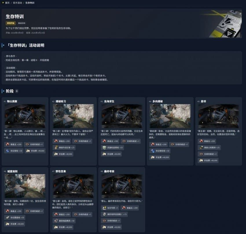 Survival Training:Stage 1: Slugs of a FeatherCondition: Enemies can only be attacked when there are 2 or more enemies of the same type in proximityStage 2: Demolition PracticeCondition: Can only use industrial explosives to fight enemiesStage 3: Survival in the Slug SeaCondition: Slugs have a shield that can only be destroyed by Axebeast's charge abilityStage 4: Multi-directional DemolitionCondition: You're attacked from multiple directions. Choose priority directions wisely.Stage 5: Bad NeighborCondition: Enemies get abilities depending on what enemies have been slainStage 6: Castle PrinciplesCondition: AIC Towers can be deployed.Stage 7: Bitter Fruit of the WildCondition: Enemies can only be attacked on their weak pointsStage 8: Final AssessmentCondition: AIC Towers can be deployed. Industrial explosives can be used. You need to survive for 10 minutes.