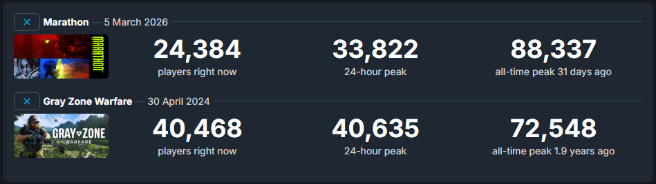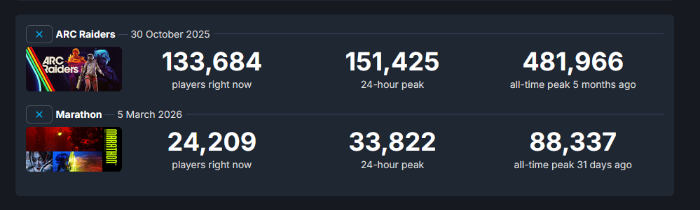 >>562682610Bungie exposes Destiny activity metrics through their API which is why sites like popularity.report exist. I'd say hopefully they'll do the same for Marathon but I have a feeling they're keeping those numbers under wraps due to the obvious bad publicity it would create. At the very least, we have confirmation from insiders at Bungie that PC represents 70-80% of the active playerbase so Steam is the easy answer for any playercount estimates with reasonable accuracy