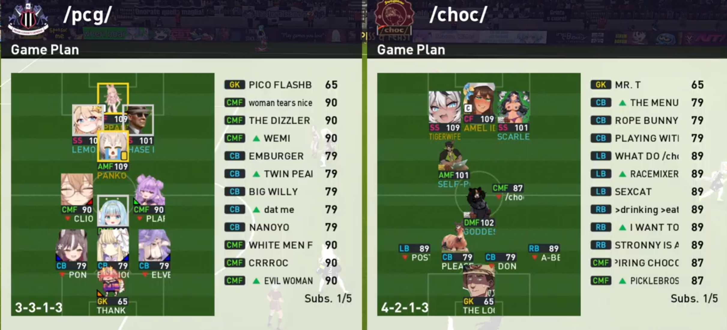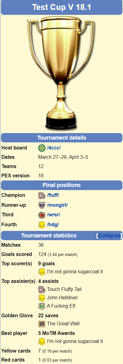 Previous: >>562492137>What... is this?Put simply, a simulation of Pro Evolution Soccer being competed between teams which are embodiments of boards of the 4chan imageboard. The players represent facets of each board's culture. All of the matches are AI versus AI. However, humans "manage" each team, creating their tactics and giving input during games as they happen to make substitutions and tactical changes as they see fit.https://implyingrigged.info/wiki/FAQ>Where can I watch the cup?https://isthisliv.com/4cc/stream.html>Ongoing Invitationalshttps://implyingrigged.info/wiki//vg/_League_26_Enemylieshttps://implyingrigged.info/wiki/Test_Cup_V_18.1>Upcoming Cupshttps://implyingrigged.info/wiki/2026_4chan_Spring_Babby_Cup_Qualifiershttps://implyingrigged.info/wiki/2026_4chan_Spring_Babby_Cuphttps://implyingrigged.info/wiki/2026_4chan_Summer_Cup>Upcoming Invitationalshttps://implyingrigged.info/wiki/2026_4CC_Champions_Leaguehttps://implyingrigged.info/wiki//ag/_League_9/11:_Never_Forgethttps://implyingrigged.info/wiki//jp/_League_1https://implyingrigged.info/wiki/Very_Genuine_and_Legit_Vidya_Game_Leaguehttps://implyingrigged.info/wiki/Beta_Bowl_4>Wiki:https://implyingrigged.info/wiki/Main_Page>Sekkrit Code37pebis>DLC Passworddivegrass>Booruhttps://isthisliv.com/booru/>Archivehttps://implying.fun/>Other videoshttps://implyingrigged.info/wiki/Videos>PES Infohttps://implyingrigged.info/wiki/Pro_Evolution_Soccer_2015https://implyingrigged.info/wiki/Pro_Evolution_Soccer_2021>PreviouslySpring Fetus soonformationpostingEnemylies18 test cup CHRIST HAS RISEN