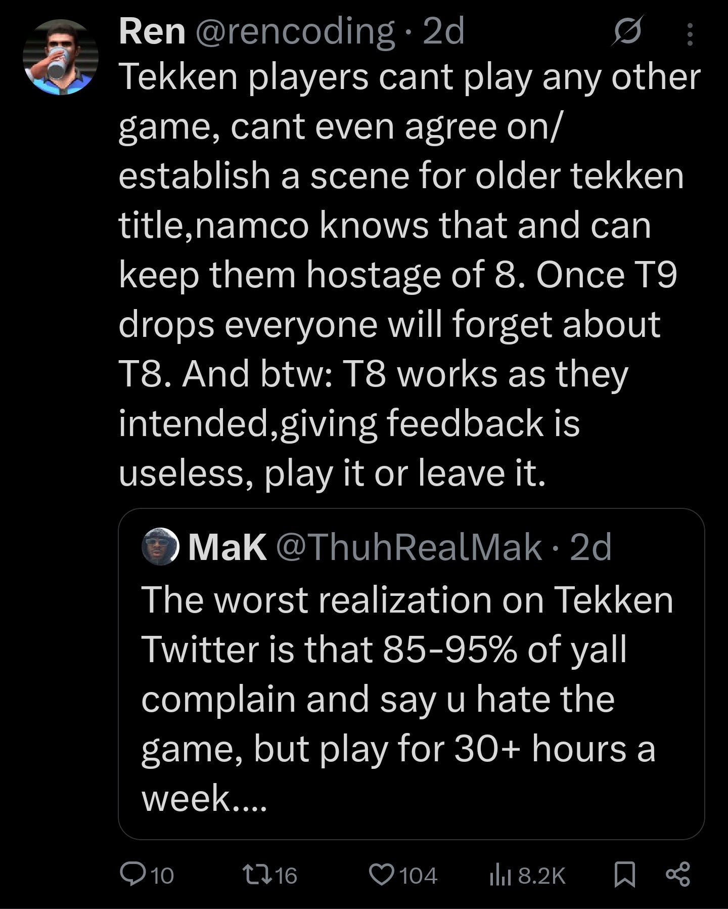 The best Tekken you've ever played is the one you played when you were 15. That's why some people swear by T5, other by T6. If people who started with T7 go back to the old games they'll bounce immediately, because without the nostalgia goggles they don't reach the kamigame level oldfags portray.