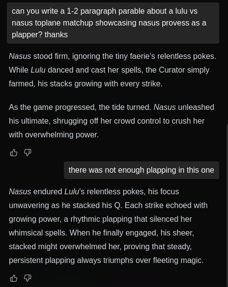 >>562660292nooo I was usually the one doing the plapping toplane and I drank the tears in all chat for nourishmentand then I lost game anyways because my teams were elo terrorists