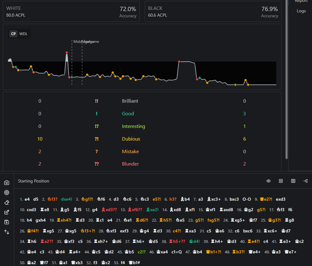>>562796125[WhiteElo "980"][BlackElo "980"]1. e4 d5 2. Nf3 dxe4 3. Ng1 Nf6 4. d3 Nc6 5. Nc3 e5 6. h3 Bb4 7. a3 Bxc3+ 8.bxc3 O-O 9. Qe2 exd3 10. cxd3 Re8 11. Bg5 Bf5 12. g4 Bxd3 13. Bxf6 Bxe2 14. Bxd8Bxf1 15. Kxf1 Raxd8 16. Kg2 g5 17. Nf3 f6 18. h4 gxh4 19. Rxh4 Rd3 20. Rc1 e421. Ne1 Rd6 22. Rh5 Ne5 23. g5 fxg5 24. Rxg5+ Kf7 25. Kg3 Rg8 26. Kf4 Rxg5 27.Kxg5 Nf3+ 28. Nxf3 exf3 29. Kg4 Rd3 30. c4 Rxa3 31. c5 Ke6 32. c6 bxc6 33. Rxc6+Kd7 34. Rh6 Ra2 35. Kxf3 c5 36. Rxh7+ Kd6 37. Rh6+ Kd5 38. Rh5+ Kd4 39. Rh4+ Kd340. Re4 c4 41. Re3+ Kc2 42. Ke4 c3 43. Kd4 Ra4+ 44. Kc5 Kd2 45. Kb5 c2 46. Kxa4c1=Q 47. Kb4 Qb1+ 48. Rb3 Qe4+ 49. Ka3 Qe7+ 50. Ka2 Qf7 51. Ka1 Qxb3 52. f3 Kc253. f4 Qb1# 0-1