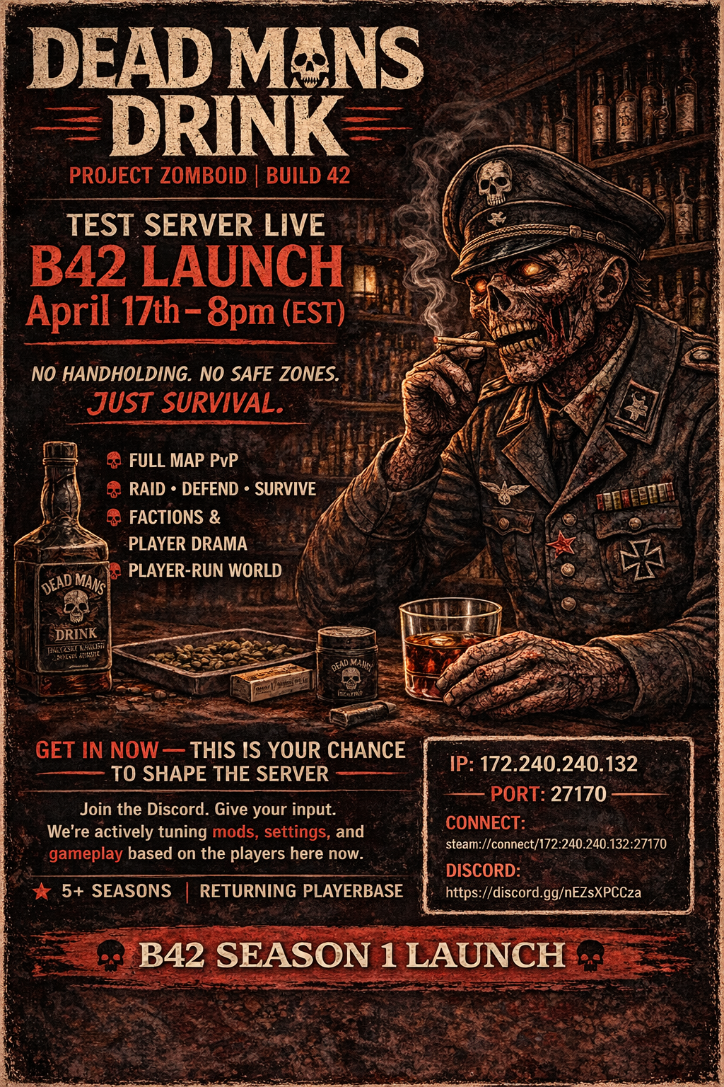Dead Mans Drink is coming back for B42test server is livelaunch april 17 @ 8pm estfull pvpno safe zonesno handholdingwe’ve run 5+ seasons already, not some random new serverright now it’s a live test phasemods/settings are being adjusted based on playersso if you join early you actually influence how it playsip: 172.240.240.132:27170steam://connect/172.240.240.132:27170discord:https://discord.gg/nEZsXPCCzaget in early or show up late and get wiped