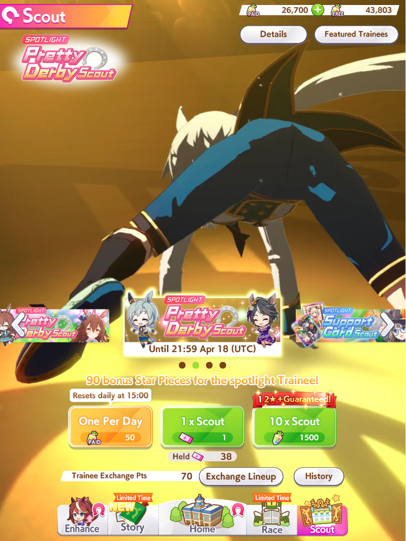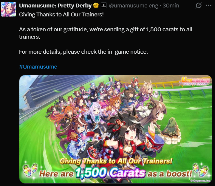 Previous: >>562642215>Global Game NewsLink your account to Cygames iDCurrent Scenario: Make A New Track aka "Trackblazer"Current Rate Up Trainee: Mejiro Bright (3*), Ballroom Seiun Sky (3*), Ballroom Fuji Kiseki (3*)Current Rate Up Support Cards: SSR Zenno Rob Roy (SPD), SSR Curren Chan (WIT), Symboli Rudolf (SSR), Sirius Symboli (SSR)>Schedule03/02 - 04/14 - Halved TP Cost & 2x Career Mode Rewards04/05 - Ballroom Seiun Sky (3*), Ballroom Fuji Kiseki (3*), Symboli Rudolf (SSR), Sirius Symboli (SSR)04/05 - Ligne Droite Story Event04/12 - Nishino Flower (3*), Daiwa Scarlet (SSR), Sweepy (SR)04/20 - Yaeno Muteki (3*), Ines Fujin (SSR), Twin Turbo (SSR)04/20 - Aries Cup - Medium/Right/Spring/Firm/200004/26 - Golshi Week Celebration04/26 - Cheerleader Nice Nature (3*), Cheerleader King Halo (3*), Bamboo Memory (SSR), Seeking the Pearl (SSR)04/26 - Tracen Cheer Squad Story Event04/30 - Ines Fujin (3*), MR. C.B. (SSR), Tokai Teio (SR)https://pages.snep.pw/uma/anni-skill-changes>JP Game NewsCurrent Rate Up: Sakura Bakushin O (3* alt), North Flight (3* alt), SSR Daring Tact, SSR Daring HeartNew Scenario "Beyond Dreams" releasedTimeline: https://uma.moe/timelineCygames Webstore: https://webstore.cygames.com/en/umamusume_en>Thread Clubshttps://rentry.co/umaglobalclublistYou must be E3 (20k points) to join a circle. Apply with /uma/ or /vg/ in your profile or post ID in the thread.>All Guides & Resourceshttps://rentry.org/uma26Game databasehttps://gametora.com/umamusume (Click the gear to switch between JP / global server info)A basic guide for newfagshttps://rentry.org/umaglobalFind networks if your region is blocked from the game or clienthttps://www.umavpn.topSeiyuu & Concertshttps://rentry.org/umstUmamusume Birthday Calendarhttps://ウマ娘.攻略.tools/events/birthdayUma Texthttps://umareader.idsmile.xyzCustom Stickershttps://schizo.farm/resources/stickers