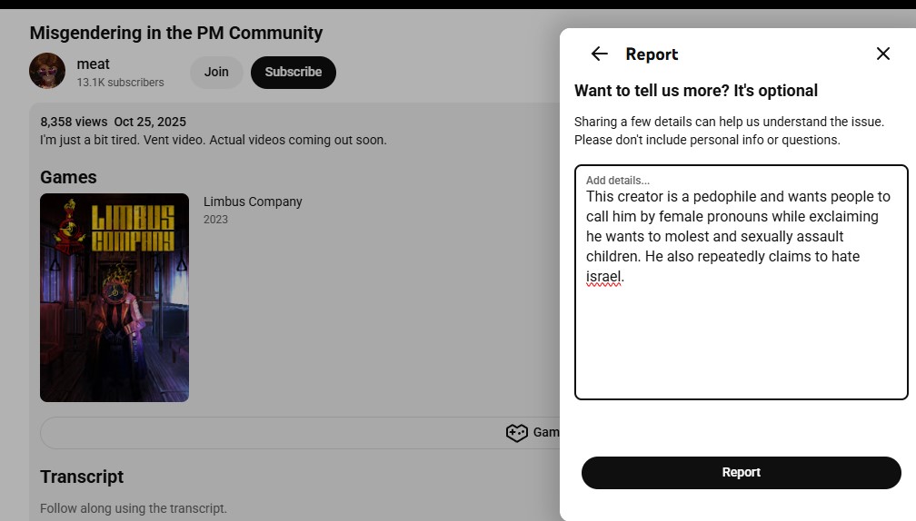 God limbus company drama is so dystopic. If it's not pedophiles grooming children on discord it's trannies (redundancy, they're also pedophiles) crying on youtube about someone calling them something they don't like and expecting the world to end at their beck and call. We can't have anything fun like a Chibinekodemyx "That's a nice jump" moment or anything. Nobody is doctoring MD runs and pretending to be legit. It's just pedophile filth. God it's tragic.