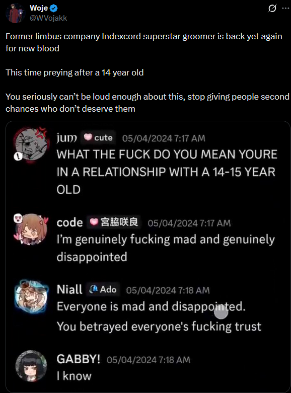 >>562664584>Former limbus company indexcord superstarWhat the actuall fuck am I reading? You can't accuse someone of being kiddy diddler and start with shit like that.