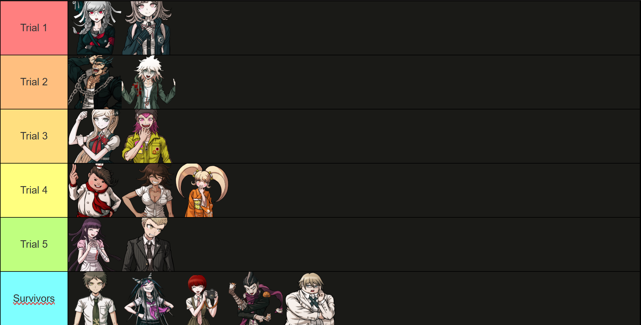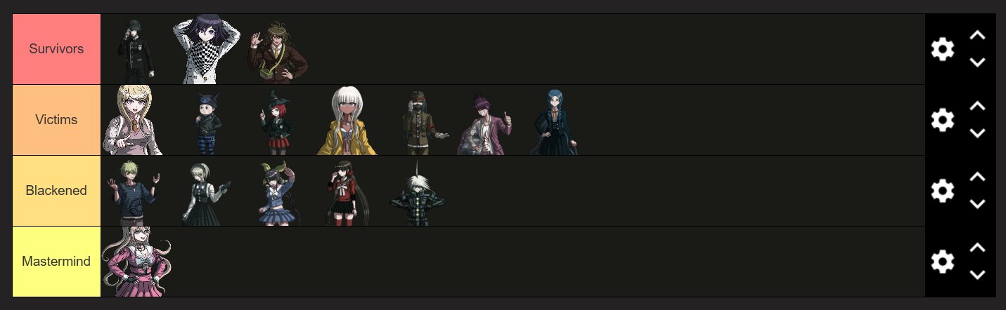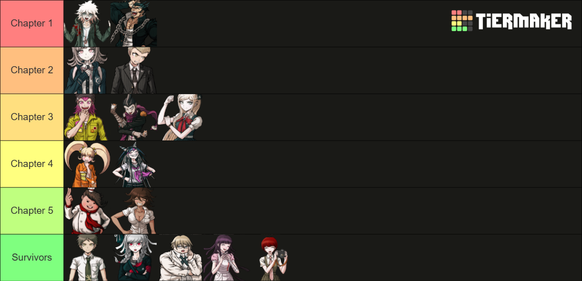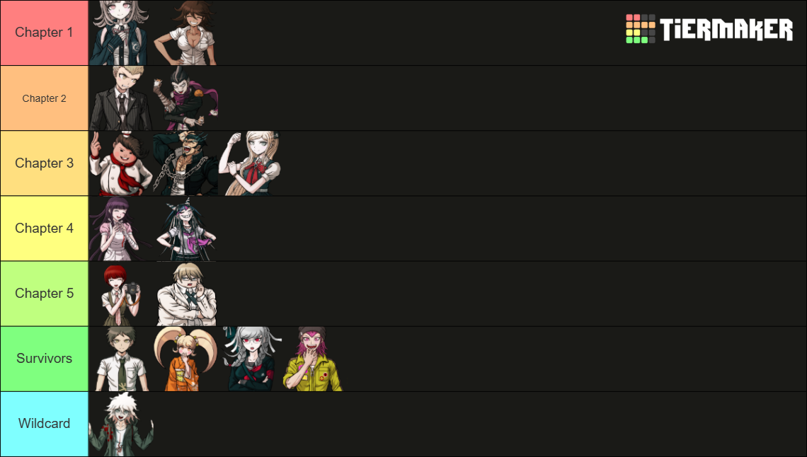 >>562667787Nagito and Chiaki being the culprit and victim of chapter 1 like in your image would be badass, but too obvious.Here's mine. For each tier: victim first, killer second (two victims for chapter 3).This is not a prediction, just sort of my dream scenario. There are many reasons why this won't happen.I already mentioned some of these yesterday, but I can elaborate on my rationale if some of these seem insane.