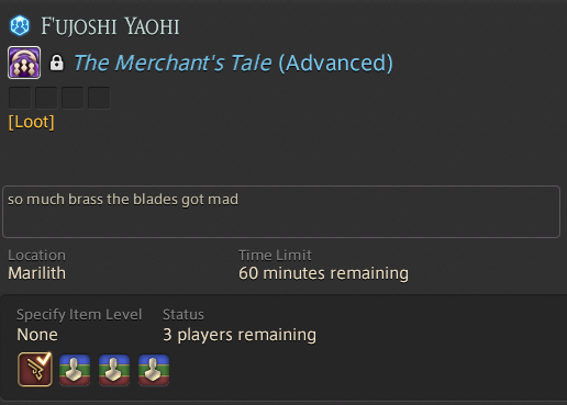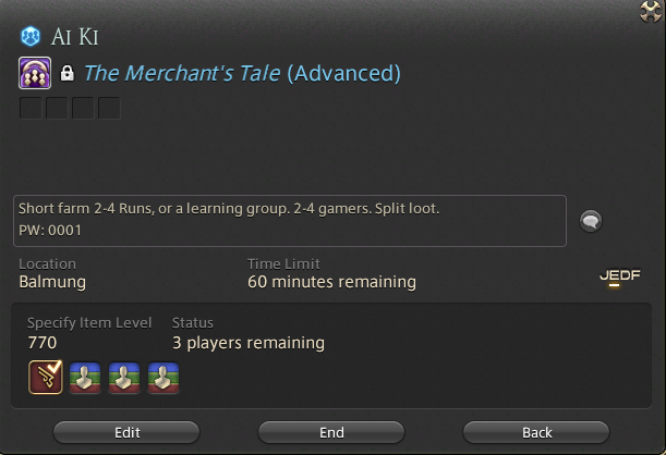 PF up for merchant's tale advanced on dynamis, password 1394. just need one or two runs for the mount :D