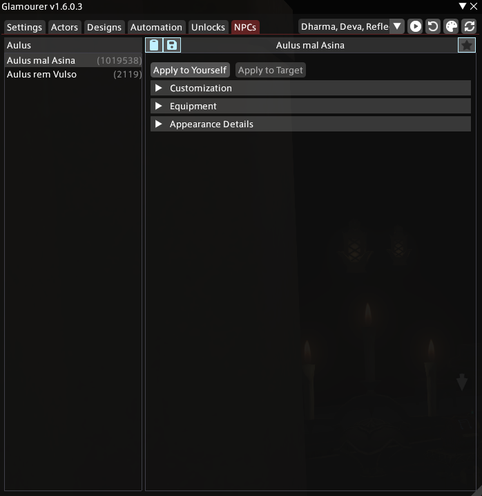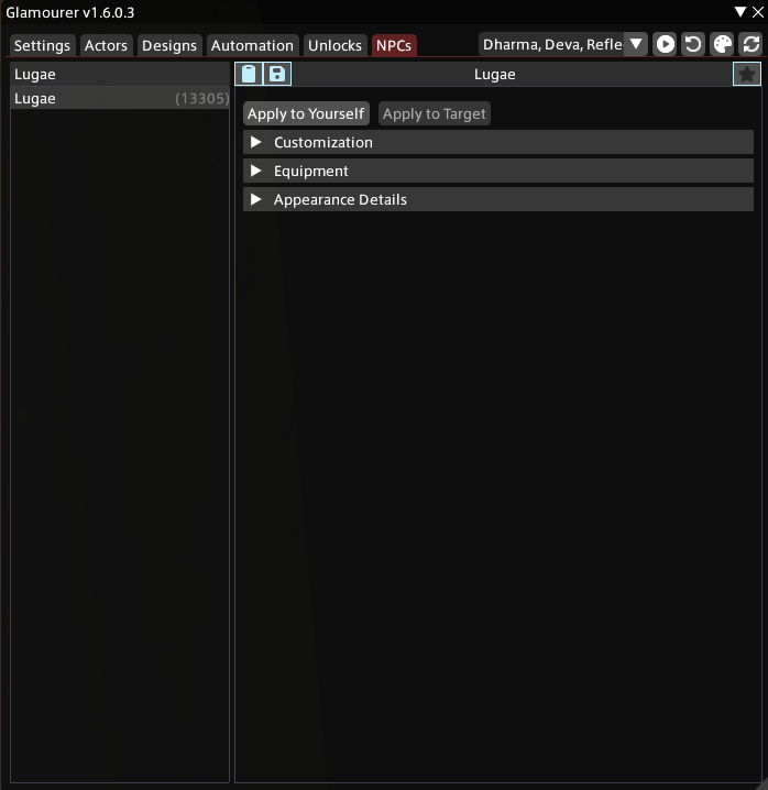 >>562689047Actually no need, here's what you do, go the NPCs tab of glamourer, type Lugae and hold CTRL as you click apply to yourself. It will only copy the outfit over instead of the character.