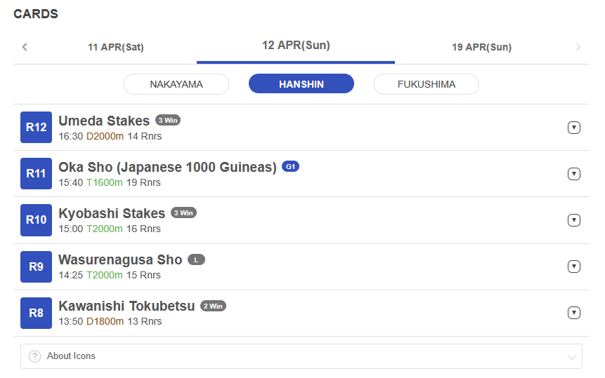 Races this weekend11th of April (sat):G2, New Zealand Trophy, 1600m Turf, 3YO only, NKH Mile Cup trialG2, Sankei Sports Hai Hanshin Himba Stakes, 1600m Turf, 4YO and up mares only12th of April (sun):G1, Oka Sho, 1600m Turf, 3YO mares only, first classic race of the year