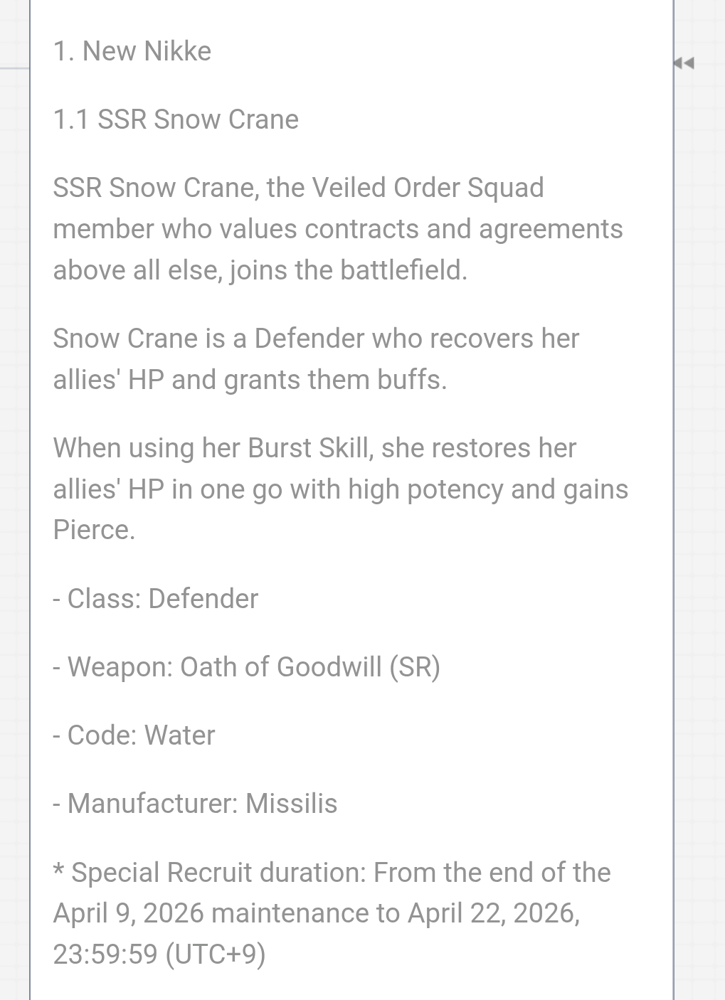 >Download - Android/iOS/PChttps://nikke-en.com/index.html>General Info/FAQ for New Playershttps://rentry.org/NikkeInfo>Additional Linkshttps://rentry.org/nikghomeALL DATES/TIMES LISTED BELOW ARE UTC+9 (KOREA TIME)>Update on March 19https://nikke-en.com/newsdetail.html?content_id=a1ffdf10aaa16a4ccaa96aaacadf61480c22>Developer's Note: March 2026https://nikke-en.com/newsdetail.html?content_id=835e7b26a7fafa4df8ab738a81b2b9f6aa3a>Current Events2X2 LOVE - March 19 ~ April 9>Upcoming EventsCo-Op: Harvester - April 10 ~ April 12Union Raid - April 10 ~ April 16>Current Special RecruitsArcana: Fortune Mate - March 19 ~ April 9>Upcoming Special RecruitsSnow Crane - April 9 ~ April 22>Current Costume PassesPrivaty: Sharp Lesson [Costume Gacha] - March 19 ~ April 9Vesti Tactical Upgrade: Pure Beginner [Event Pass] - March 19 ~ April 9Viper: Punky Street [Event Pass/Razer Collab] - March 26 ~ April 16Sora: Spring Flight [Mission Pass] - April 1 ~ April 30Clay: Cheer Up Training [Login Event] - April 2 ~ April 30>Upcoming Costume PassesTBA>CodesMILLIONCOMMANDERS (04/30/2026)Previous: >>562653724