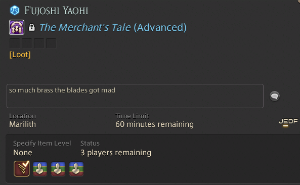 I found a minion and music scroll I didn't have yet! Crisis averted! But all the mats are cheap as shit on the MB.Anyone need their Kozama'uka Shared FATEs? Gonna try and hope I can get the last two demiatma I need from there so why not come knock out at the same time?