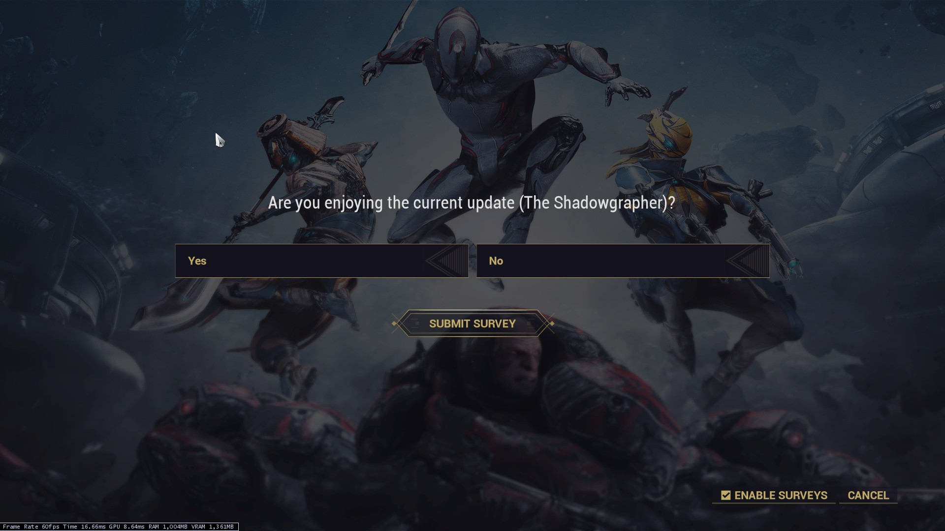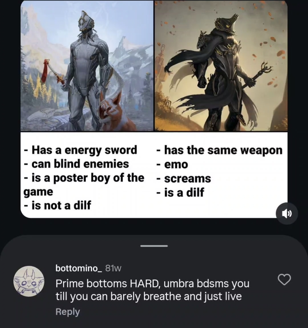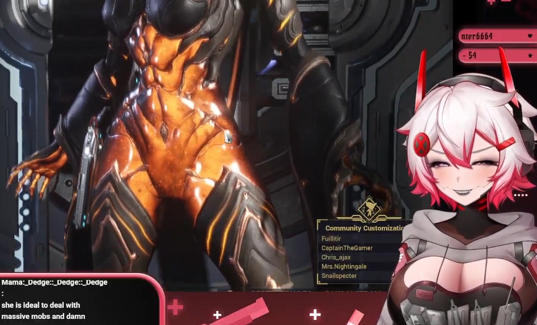>HELLO TENNO>WE APPRECIATE YOUR SUPPORT AT TENNOCON 20XX>AND WE'VE HEARD YOUR DEMANDS>WE WILL LEAN MORE HEAVILY INTO THE LATEX CATSUITS>WE EVEN GOT STEVE TO DISCONNECT HIS SEVERED HEAD FROM THE NEURAL NETWORK TO ANNOUNCE THE MOST ANTICIPATED FRAME IN OUR DEVELOPMENT TEAM'S STORIED HISTORY>THANK YOU, REBECCA. YOU LOOK LIKE A RAPIST.>AND NOW WE REVEAL THE 69th WARFRAME>MEET.... 61MP!unironically, if the 69th frame isn't female at the very least, I'll lose faith in DE's sense of humor