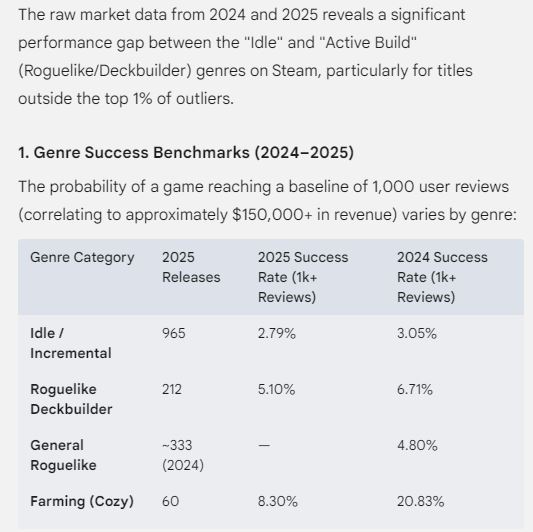>>562730082they have a 2% rate of reaching 1k reviews, worse than roguelike deckbuilders and other genres, you're looking at extreme outliers the average incremental game (10+ release every week) flops