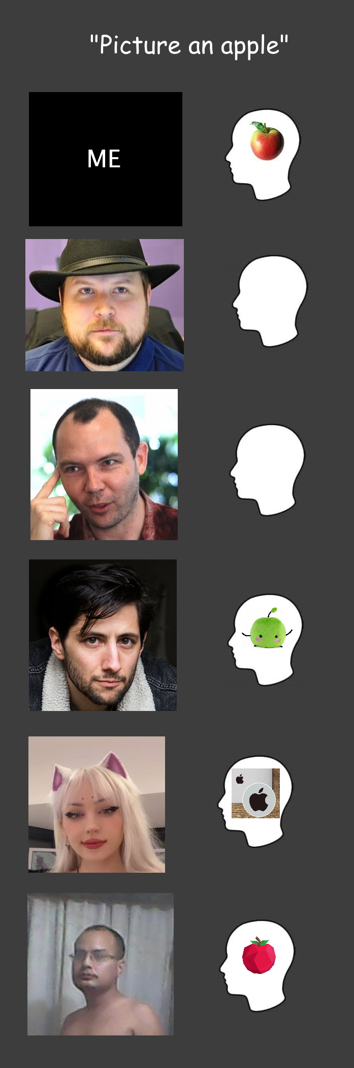 >>562718197I never get this "aphantasia" bullshit, are you supposed to just fool your own vision and spawn an apple in front of you, or does it count if you can only imagine it
