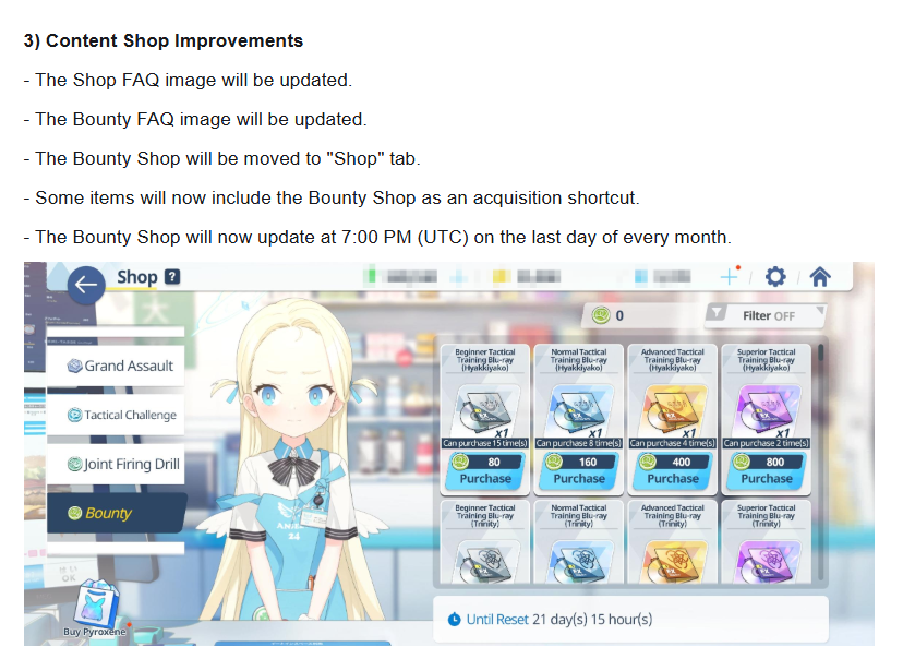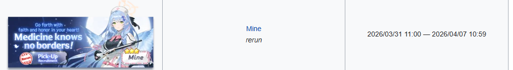Previous Thread: >>562703537>Guides, Resources and useful links:https://rentry.org/bagguides>/bag/Circles/Clubs/Friends:https://rentry.org/holdingthebag>4koma, Manga, Side Content, PVs & Shortshttps://rentry.org/bacontent>>(JP) – JST>Banners:>4/1 After Maint – 4/15 10:59Akane (School)Seia (Limited)Asuna (School – Limited)Karin (School – Welfare)Toki (Bunny)>News:Patch notes: https://bluearchive.jp/news/newsJump/645>Events:Code: BOX - The Shadow Approaching Millennium – 4/1 After Maint – 4/15 10:59Balancing Schale's Books with the General Student Council – 4/15 11:00 – 4/21 10:59>Content:Joint Firing Drill (Breakthrough) – 4/1 After Maint – 4/8 3:59Grand Assault: Perorodzilla (Field – Torment w/Heavy & Special Armor) – 4/8 11:00 – 4/15 3:59Limit Break Assault: Tiphareth (Indoor – w/Elastic Armor) – 3/19 11:00 – 4/21 3:592x Lesson/Scrimmage – 4/1 4:00 – 4/8 3:592x Hard – 4/8/ 4:00 – 4/15 3:592x Commissions/Bounty – 4/15 4:00 – 4/21 3:59>>(GLOBAL) – UTC>Banners:>4/7 After Maint – 4/21 1:59TakaneYakumoMeru, MomijiMinoriShigure (Hot Spring)Serika (Swimsuit)>News:Patch notes: https://forum.nexon.com/bluearchive-en/board_view?thread=3415801>Events:Winter Sky's Renaissance: Thesis on Cultural Exchange – 4/7 After Maint – 4/21 1:59My Office: https://bluearchive.nexon.com/user/myoffice>Content:Total Assault: Kurokage (Urban) – 4/7 After Maint – 4/13 18:59Joint Firing Drill (Breakthrough) – 4/14 2:00 – 4/20 18:59Limit Break Assault: Chokmah (Field – w/Heavy Armor) – 4/8 2:00 – 4/27 18:592x Bounty – 4/6 19:00 – 4/13 18:592x Account EXP – 4/10 19:00 – 4/12 18:592x Normal/Hard – 4/13 19:00 – 4/20 18:592x Account EXP – 4/17 19:00 – 4/19 18:592x Lesson/Scrimmage – 4/20 19:00 – 4/27 18:592x Bounty – 4/27 19:00 – 5/4 18:59