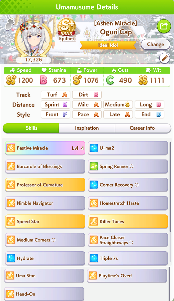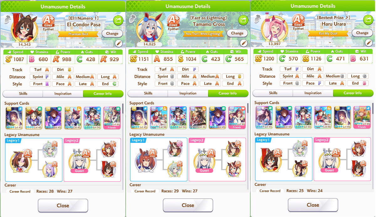 I can build 1.2k/700/1.2k/500/1kBut the uma will almost always loose tenno sho spring since the uma would be at stats of 850/500/800/300/700 ish at that pointHow the fuck do you win that without recoveries? That's the only race my umas lose but the rest are ezpzOguri and Goldship are the exception, they just win everything, Idk why other umas lose tenno sho with those stats