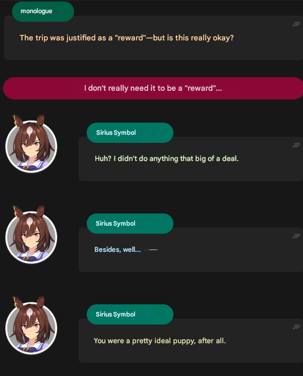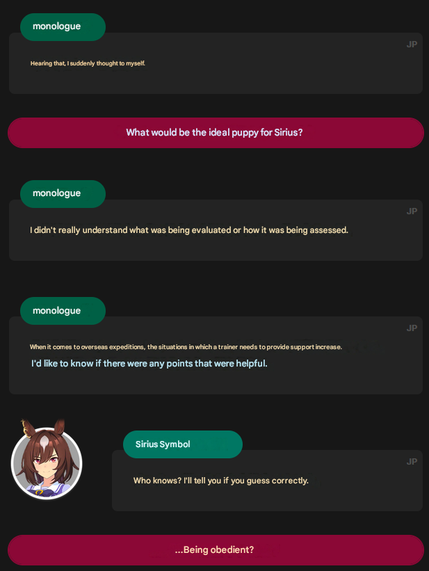 after some testing i have concluded that this dober is capable of beating dirty xoguri + 2 dom comps with her own singular dominatoronly thing left i can improve here is to use nsm instead of oyl and bring more late-race speed like shadow break/barcarole or use red shift incase she shoots up into 3-4 for some reason, but i think i will leave that for nishino later