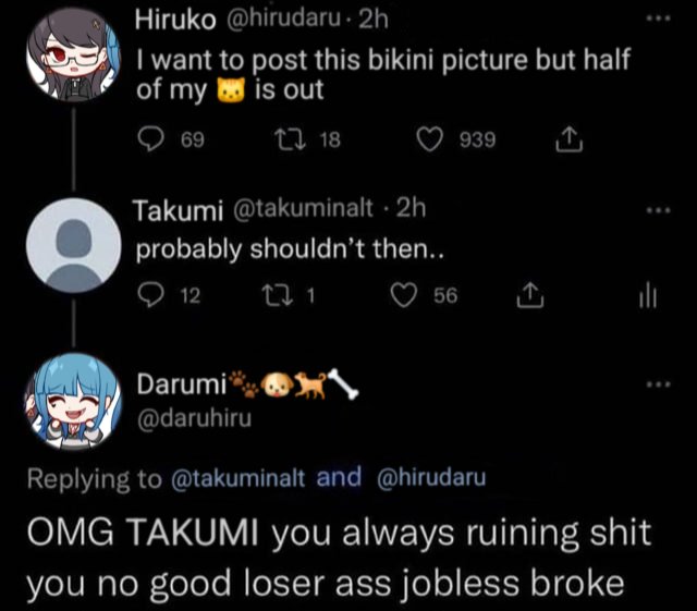 >>562747769>Hiruko pretending to care about Darumi>Hiruko knowing about Darumi's shit life>still deciding to make Darumi as her dog slaveI truly despise Hiruko whenever she's in the spotlight.