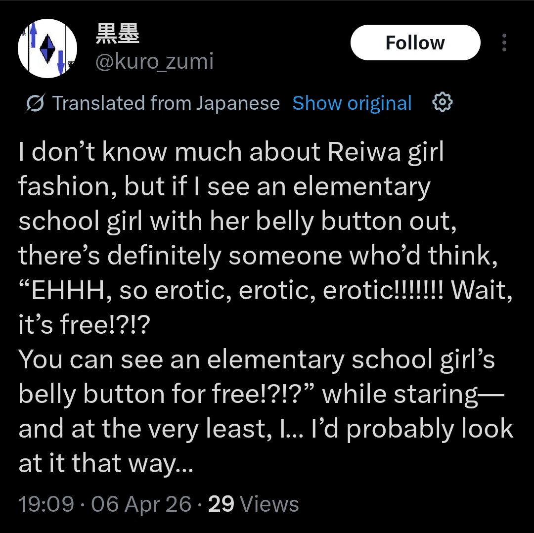 >>562817373>>562816097When I saw your post I was going to reply before reading "so what? no one cares but retarded virtue signalers" until i read the actual contents of the image and saw he's actually sexualizing REAL children. I seriously hope this guy rots in hell.