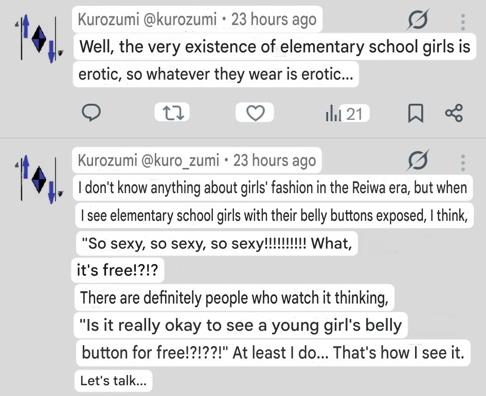 >>562816097They clearly don't talk about themselves but about creeps sexualizing teenagers because of clothes revealing body parts