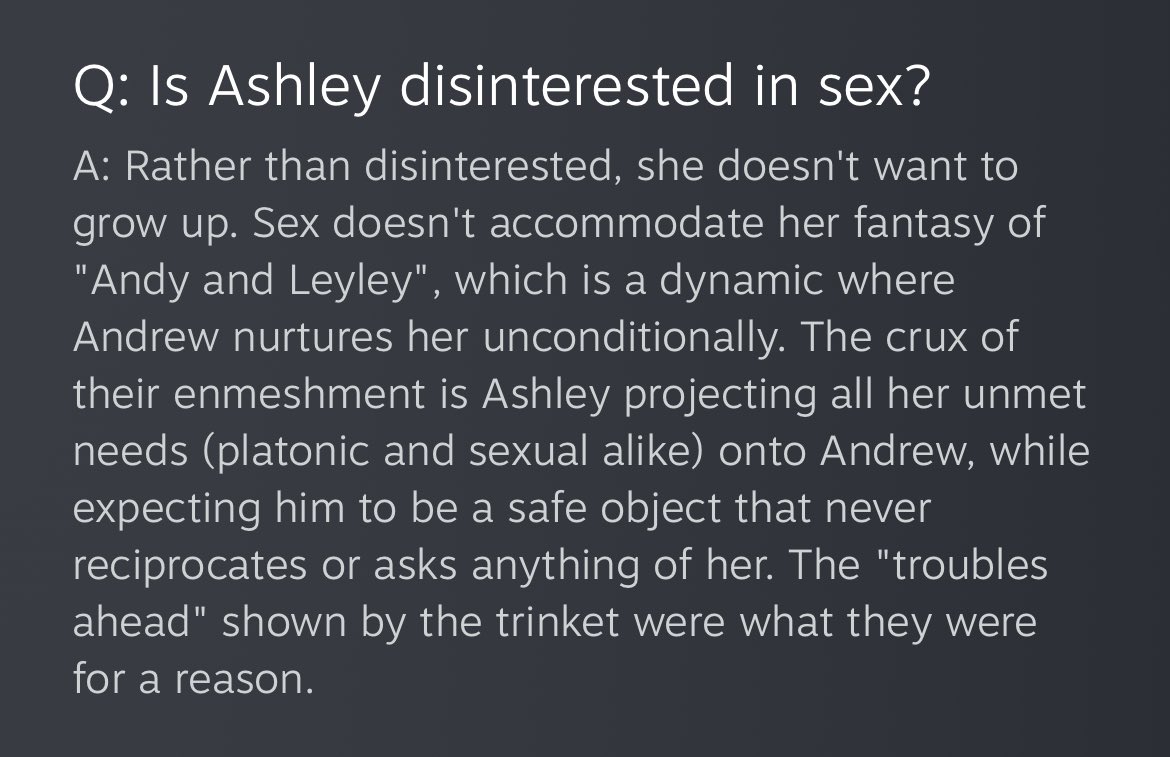 >>562772174Ashley represents the easiest scapegoat for Andrew's problems, when in reality his issues are deep, interconnected, and only tangentially related to Ashley. It's easier for him to say, "if Ashley weren't around, I wouldn't be having these issues," because it's pure cope on his part. You can see this after he kills Ashley and wow would you look at that his life is still miserable.
