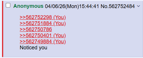 >>562754609I'm an endbaby, I literally joined the day the billboard club was raided because the event piqued my curiosity>>562755436It's normal for males. If I want (You)s I can just post a catbox (or could if I had my laptop)>>562756124Femroes are based