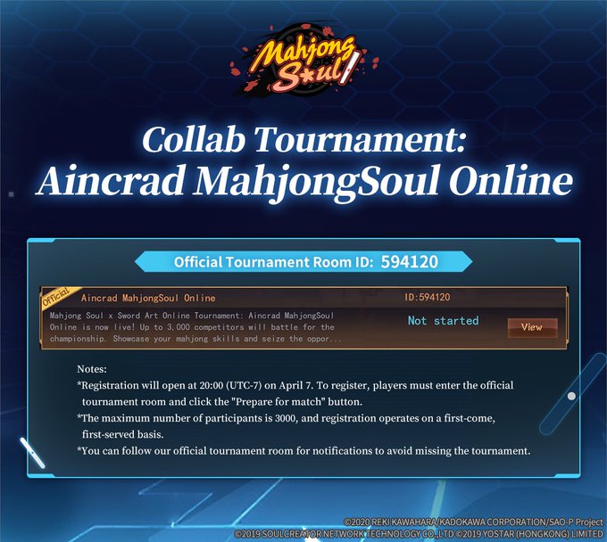 If you're starved for tourney, here is some from outside /mjg/ happening this month.First none other than The official Yostar tournament for the Sword Art Online(tm) collab starting soon.No registration needed (3000 players entry limit), schedule in pic related, more info on the majsoul social account. Still best of consecutive 3, but now limit of 10 games max so you don't have to grind all night.Dofume Jamboree 2026, some tourney from some literally who >vtuber, but seems you don't need to watch her or like vtubers to join (need to join discord though). Start April 18. Local yaku allowed and best of consecutive 3 qualifiers into top32 and cash prize for the top6 (+ some coppers lmao).https://docs.google.com/document/d/1GPHFpyvqrqbFpSLTqzvycE2fqUWSMXqNR4ncCW9Vc_I/edit?tab=t.0#heading=h.azhled2v2pfwIf you know other online tournaments happening soon please let me know.