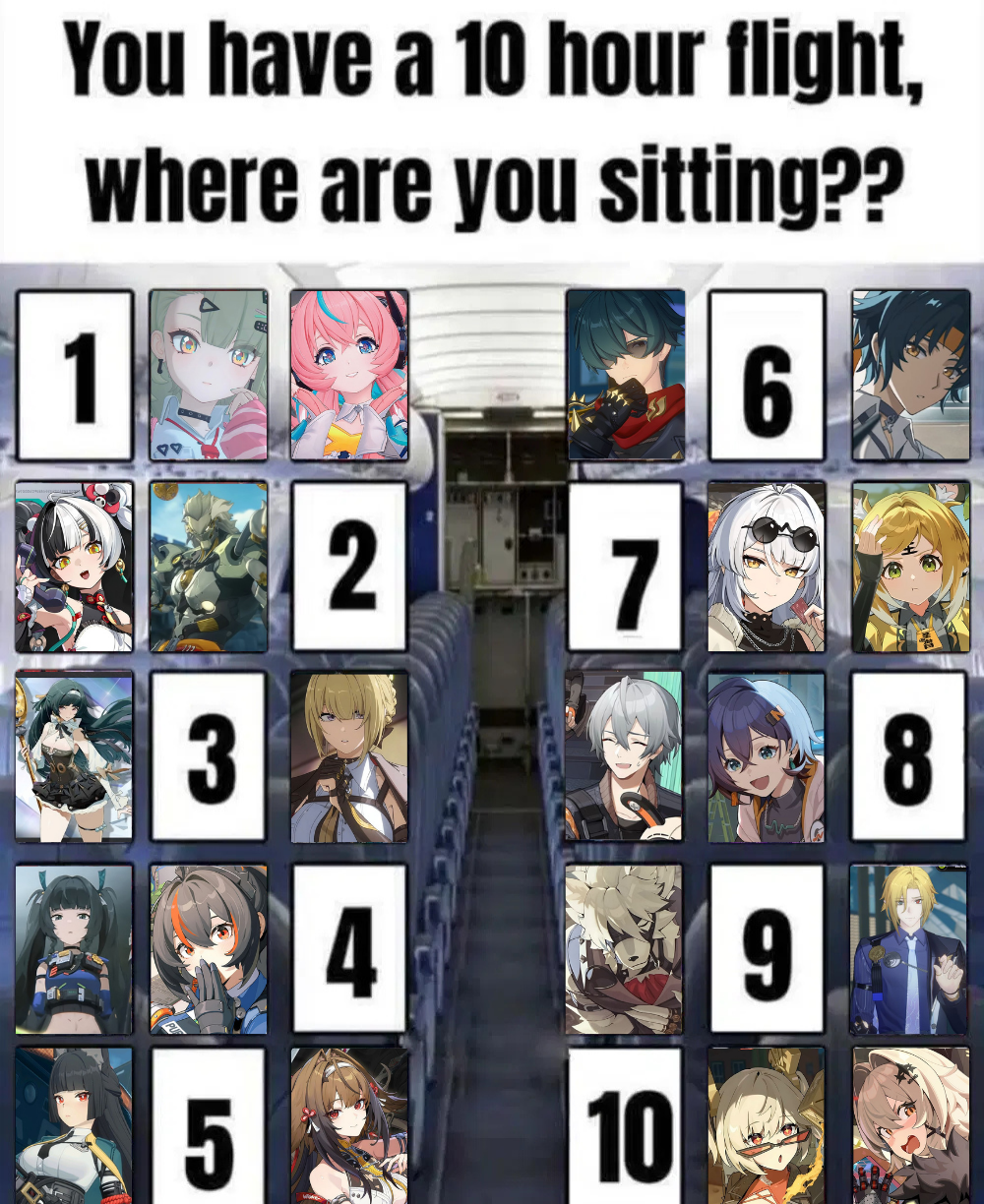 >>5627628572 or 6. Probably 6, because Banyue seems like he's so wide that he might occupy more than just his own seat. Lighter and Harumasa will probably just chill for the length of the plane ride.Considered 8 or 10, but Belle and Burnice are both too high-energy for me to enjoy sitting next to them in economy seating for hours.