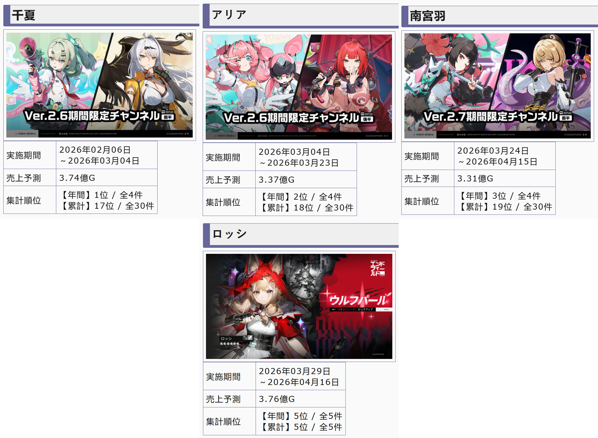 >>562785549Characters we know are coming up:Cissia + Seed - Second half of 2.7Promeia + S Billy - First and second half of 2.8Some combination of Velina, Norma, and Ramiel - 3.0If last year is anything to go by we should be getting a season 3 trailer sometime this month to get a shot of like 10 new season 3 characters all at once + a preview of the new region. If that holds up, expect it probably about midway through Cissia's banner.